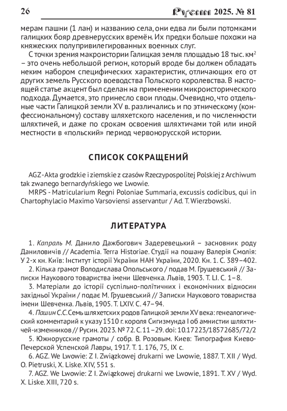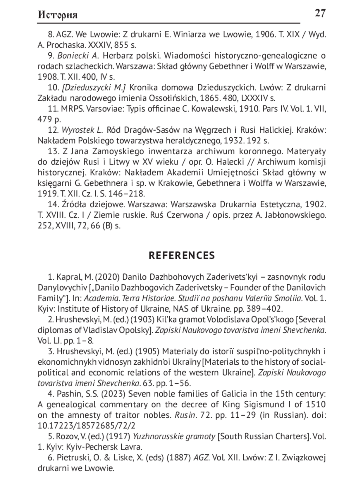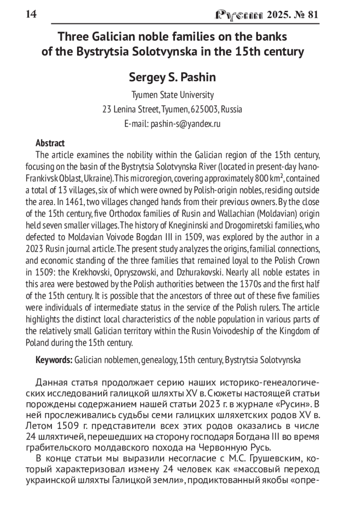 4. Пашин С.С. Семь шляхетских родов Галицкой земли XV века: генеалогический комментарий к указу 1510 г. короля Сигизмунда I об амнистии шляхтичей-изменников // Русин. 2023. № 72. С. 11-29. DOI: 10.17223/18572685/72/2 EDN: AYXURD