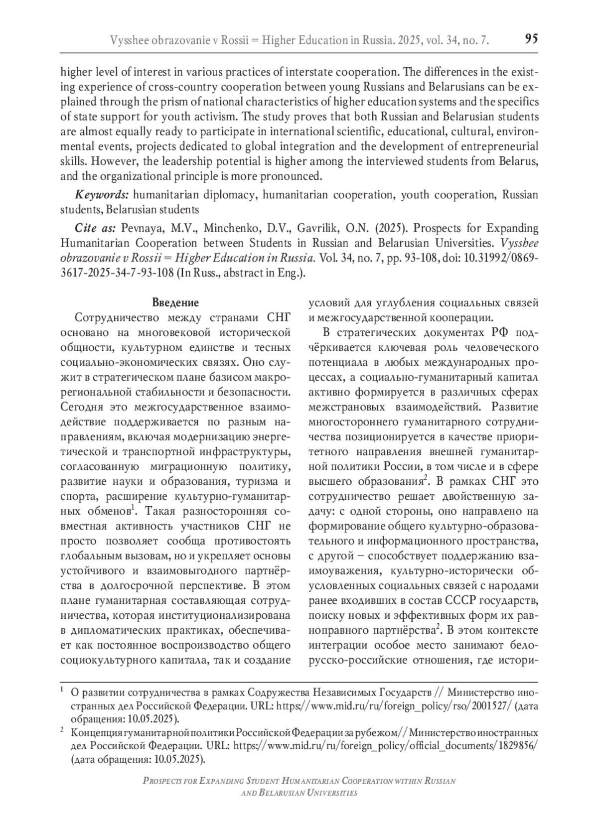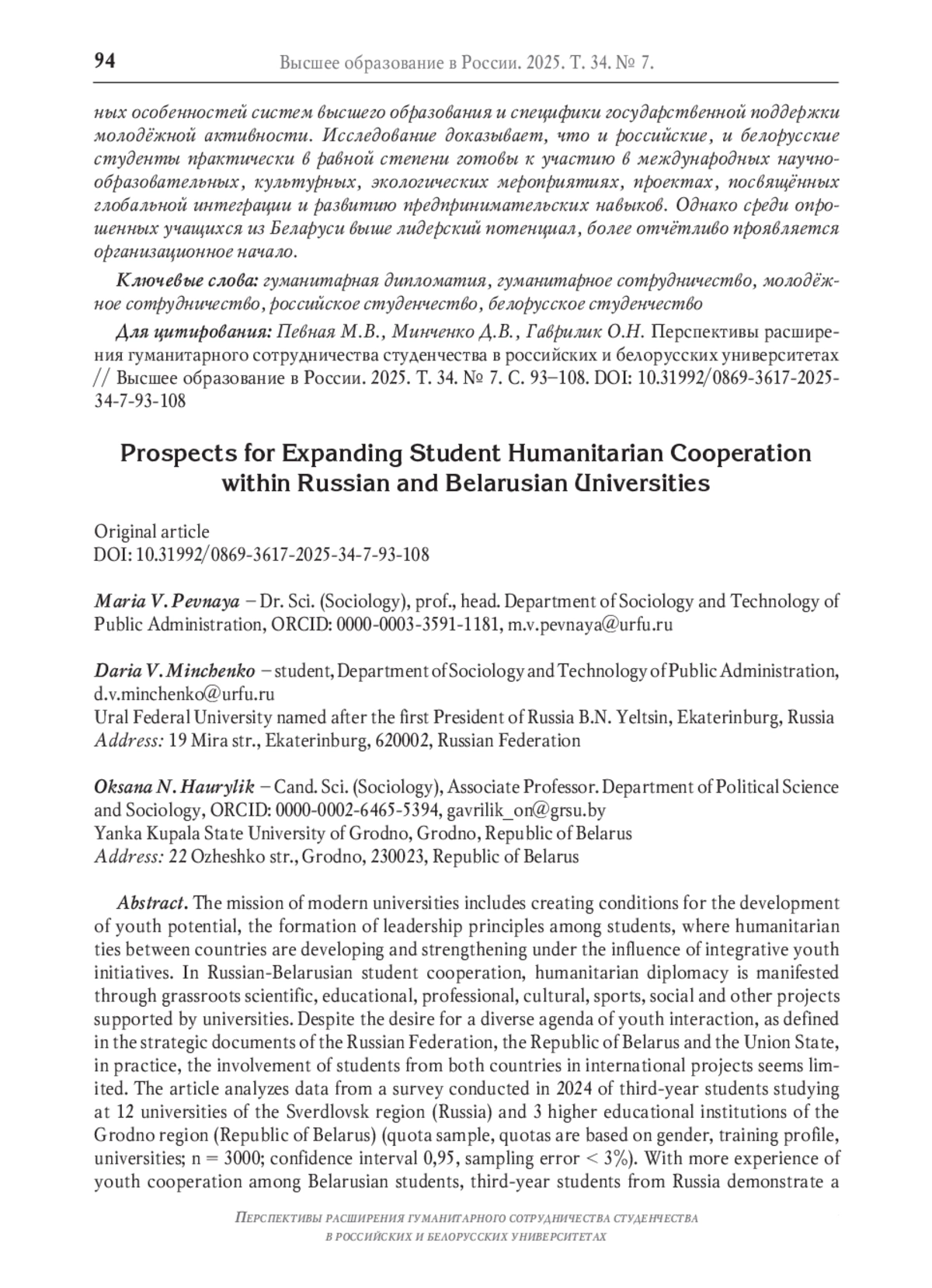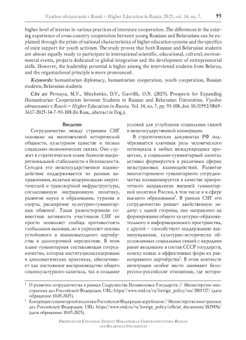 Миссия современных университетов включает создание условий для раскрытия молодёжного потенциала, формирования лидерских начал в студенческой среде, где под влиянием интегративных молодёжных инициатив развиваются и укрепляются гуманитарные связи между странами. В российско-белорусском студенческом сотрудничестве гуманитарная дипломатия проявляется через низовые научные, образовательные, профессиональные, культурные, спортивные, социальные и иные проекты, поддерживаемые университетами. Несмотря на стремление к разноплановой повестке молодёжного взаимодействия, как определяется в стратегических документах РФ, Республики Беларусь и Союзного государства, на практике вовлечённость студентов обеих стран в международные проекты видится ограниченной. В статье анализируются данные проведённого в 2024 году опроса студентов 3-го курса, обучающихся в 12 университетах Свердловской области (Россия) и 3 высших учебных заведений Гродненской области (Республика Беларусь) (выборка квотная, квоты выдержаны по полу, профилю подготовки, вузам; n = 3000; дов. интервал 0,95, ошибка выборки < 3%). При большем опыте молодёжного сотрудничества белорусских студентов, более высокий уровень заинтересованности в различных практиках межгосударственного взаимодействия демонстрируют третьекурсники из России. Проявившиеся различия в уже имеющемся опыте межстранового сотрудничества молодых россиян и белорусов могут объясняться свозь призму национальных особенностей систем высшего образования и специфики государственной поддержки молодёжной активности. Исследование доказывает, что и российские, и белорусские студенты практически в равной степени готовы к участию в международных научно-образовательных, культурных, экологических мероприятиях, проектах, посвящённых глобальной интеграции и развитию предпринимательских навыков. Однако среди опрошенных учащихся из Беларуси выше лидерский потенциал, более отчётливо проявляется организационное начало.