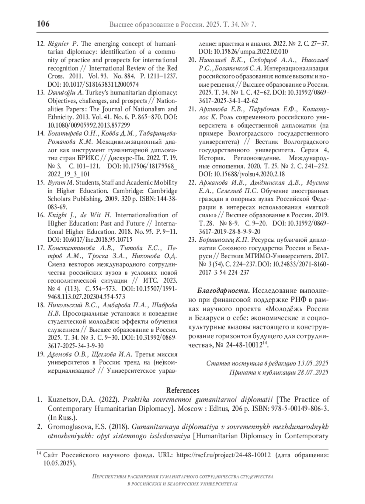 20. Николаев В.К., Скворцов А.А., Николаев Р.С., Богатенков С.А. Интернационализация российского образования: новые вызовы и новые решения // Высшее образование в России. 2025. Т. 34. № 1. С. 42-62. DOI: 10.31992/0869-3617-2025-34-1-42-62 EDN: QLHLOA