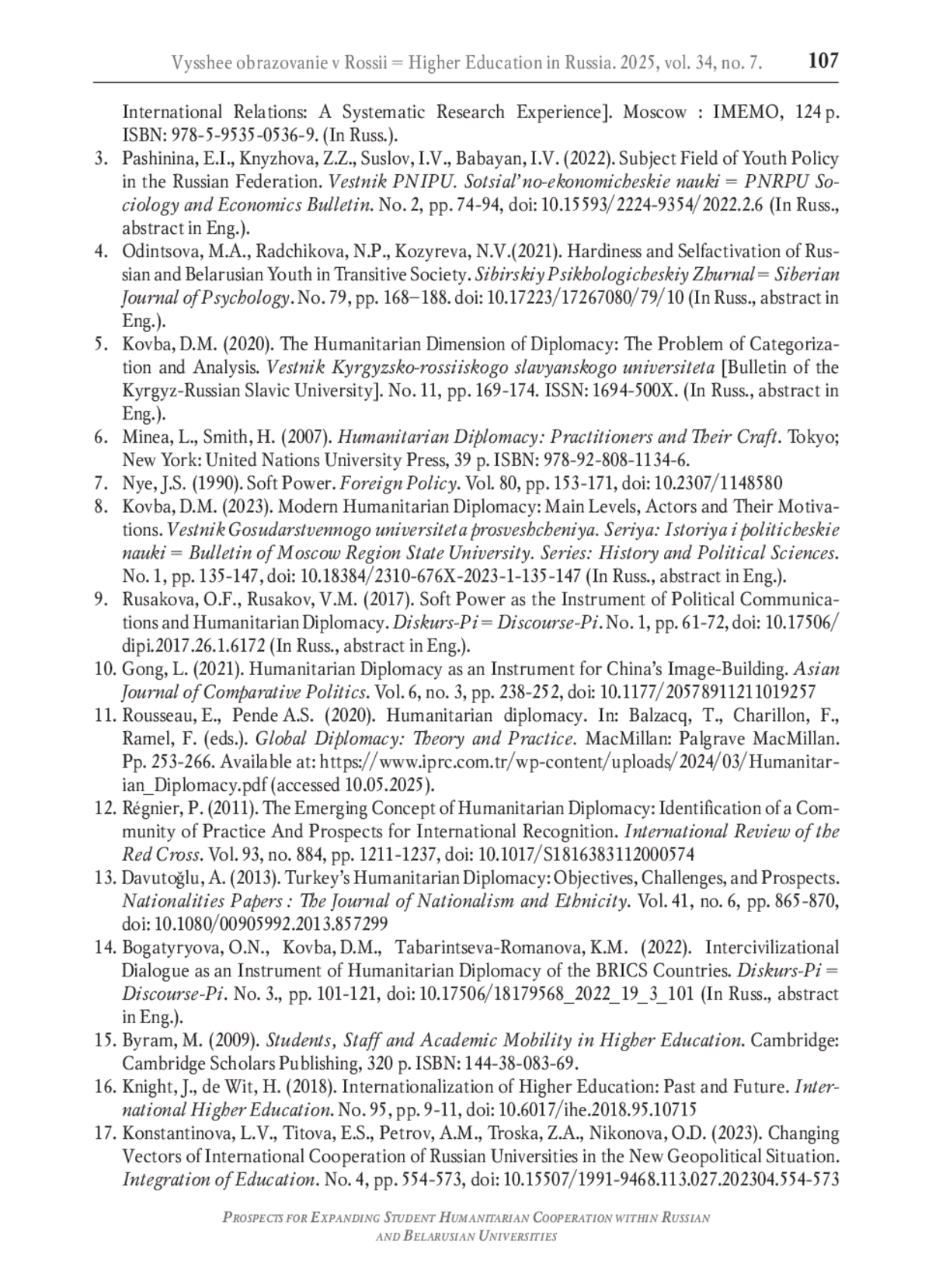 22. Аржанова И.В., Дыдзинская Д.В., Мусина Е.А., Селезнев П.С. Обучение иностранных граждан в опорных вузах Российской Федерации в интересах использования “мягкой силы” // Высшее образование в России. 2019. Т. 28. № 8-9. С. 9-20. DOI: 10.31992/0869-3617-2019-28-8-9-9-20 EDN: CFCLXC