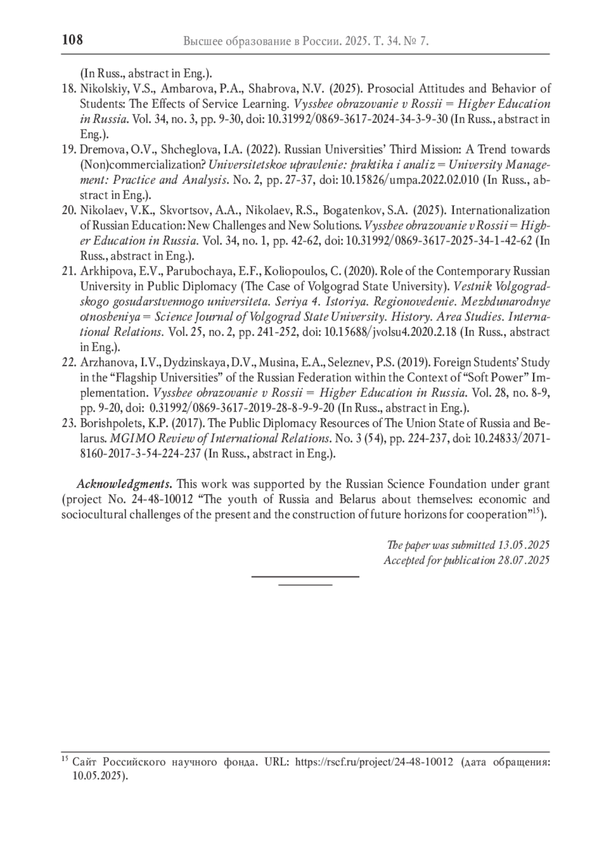 18. Никольский В.С., Амбарова П.А., Шаброва Н.В. Просоциальные установки и поведение студенческой молодёжи: эффекты обучения служением // Высшее образование в России. 2025. Т. 34. № 3. С. 9-30. DOI: 10.31992/0869-3617-2025-34-3-9-30 EDN: QPCYQZ