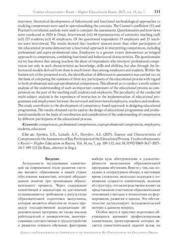 Вопросы интерпретации компетенций преподавательским составом, обучающимися вузов и работодателями представляют особый интерес, учитывая важность, которую занимает данное понятие при организации образовательного процесса. Целью исследования является установление близости оценок ключевых участников образовательного процесса в высшей школе относительно сущности и содержания компетенций, профессиональных и надпрофессиональных. Сбор данных осуществлялся посредством анкетного опроса и экспертного интервью, при операционализации понятий использовались теоретические разработки поведенческого и функционального методологических подходов изучения компетенций. Для сопоставления оценок использованы коэффициент Крамера (V) и корреляционный анализ Пирсона. Анкетирование и интервью проводилось в 2024 г. в г. Омске. Опрошено: (n1) 44 представителя преподавательского состава вузов; (n2) 215 обучающихся; (n3) 41 работодатель. Из проанкетированных респондентов проинтервьюировано 19 работодателей и 23 преподавателя. Результаты показали, что в ответах преподавателей в большей степени, чем у других участников образовательного процесса проявляется функциональный подход при интерпретации компетенций как понятия, в том числе профессиональных и надпрофессиональных. Работодатели в большей степени демонстрируют интегральный подход к компетенциям, объединяющий характеристики функционального и поведенческого. Анкетирование показало, что среди преподавателей значительно меньше, чем среди работодателей и обучающихся, доля респондентов, которая интерпретирует профессиональные компетенции не только в таких характеристиках как: знания, навыки и умения, но также через производные от них модели поведения. В рамках представленной работы выявление различий в оценках проводилось на основе сравнения мнений трёх ключевых участников образовательного процесса в отношении как профессиональных, так и надпрофессиональных компетенций. Это позволило провести многосубъектный анализ понимания такой важнейшей составляющей образовательного процесса, как компетенции, со стороны профессорско-преподавательского состава, обучающихся и работодателей. Особенностью проведённого многосубьектвного анализа является наличие опыта взаимодействия при реализации образовательных программ и трудоустройстве между проанкетированными и проинтервьюированными работодателями, преподавателями и обучающимися. Исследование вносит вклад в развитие компетентностного подхода при проектировании образовательных программ. Полученные результаты могут быть использованы в работе по проектированию образовательных программ и профессиональных стандартов на основе согласования и учёта понимания компетенций разными участниками образовательного процесса.