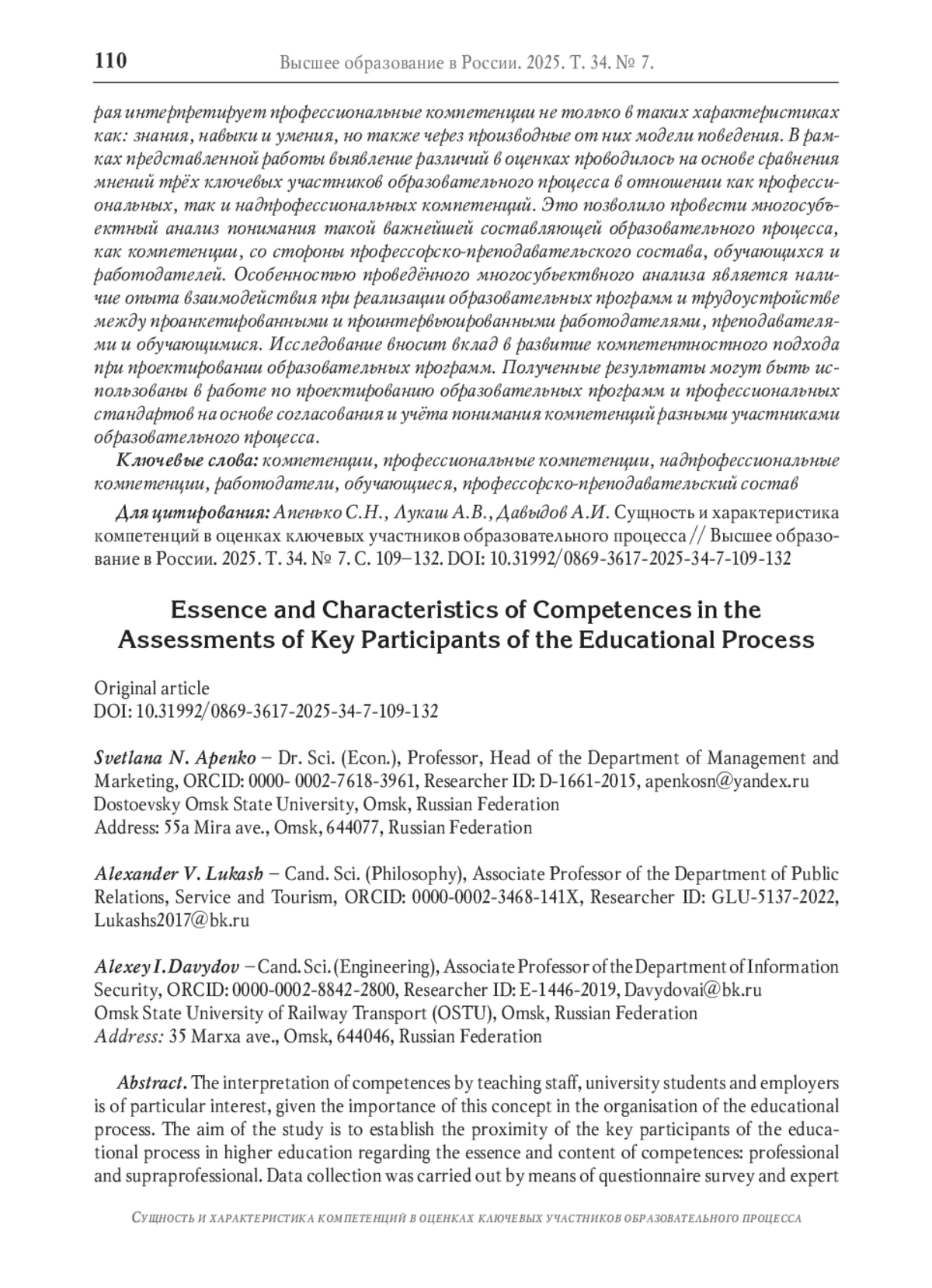 7. Апенько С.Н., Коньшунова А.Ю. Формирование профессиональных и надпрофессиональных компетенций в рамках образовательных программ высшего образования // Инновационная экономика и общество. 2024. № 2. С. 85-93. EDN: GCHCEU