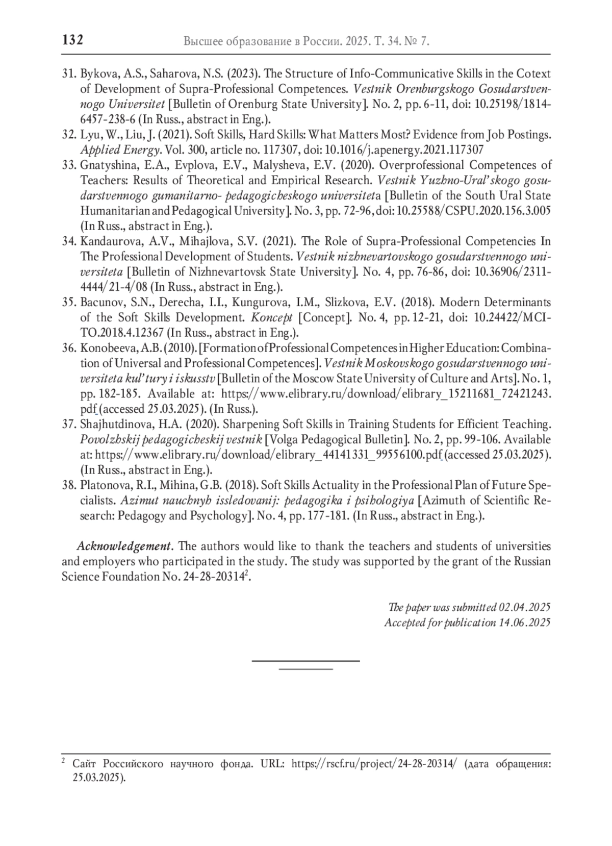 33. Гнатышина Е.А., Евплова Е.В., Малышева Е.В. Надпрофессиональные компетенции педагогов: результаты теоретического и эмпирического исследования // Вестник Южно-Уральского государственного гуманитарно-педагогического университета. 2020. № 3. С. 72-96. DOI: 10.25588/CSPU.2020.156.3.005 EDN: TXZSMA
