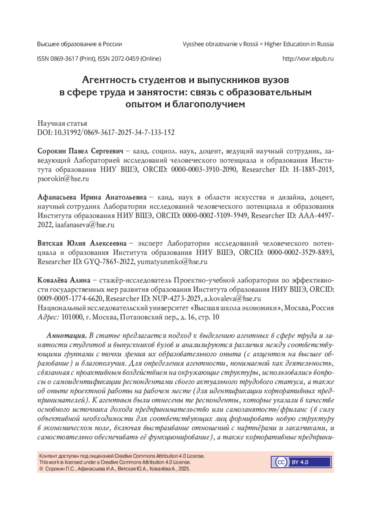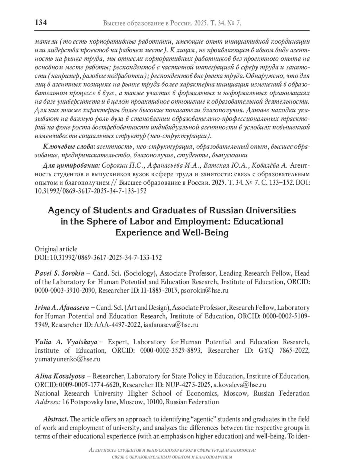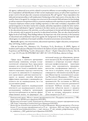 В статье предлагается подход к выделению агентных в сфере труда и занятости студентов и выпускников вузов и анализируются различия между соответствующими группами с точки зрения их образовательного опыта (с акцентом на высшее образование) и благополучия. Для определения агентности, понимаемой как деятельность, связанная с проактивным воздействием на окружающие структуры, использовались вопросы о самоидентификации респондентами своего актуального трудового статуса, а также об опыте проектной работы на рабочем месте (для идентификации корпоративных предпринимателей). К агентным были отнесены те респонденты, которые указали в качестве основного источника дохода предпринимательство или самозанятость/фриланс (в силу объективной необходимости для соответствующих лиц формировать новую структуру в экономическом поле, включая выстраивание отношений с партнёрами и заказчиками, и самостоятельно обеспечивать её функционирование), а также корпоративные предприниматели (то есть корпоративные работники, имеющие опыт инициативной координации или лидерства проектов на рабочем месте). К лицам, не проявляющим в явном виде агентность на рынке труда, мы отнесли корпоративных работников без проектного опыта на основном месте работы; респондентов с частичной интеграцией в сферу труда и занятости (например, разовые подработки); респондентов вне рынка труда. Обнаружено, что для лиц в агентных позициях на рынке труда более характерна инициация изменений в образовательном процессе в вузе, а также участие в формальных и неформальных организациях на базе университета и в целом проактивное отношение к образовательной деятельности. Для них также характерны более высокие показатели благополучия. Данные находки указывают на важную роль вуза в становлении образовательно-профессиональных траекторий на фоне роста востребованности индивидуальной агентности в условиях повышенной изменчивости социальных структур (нео-структурации).