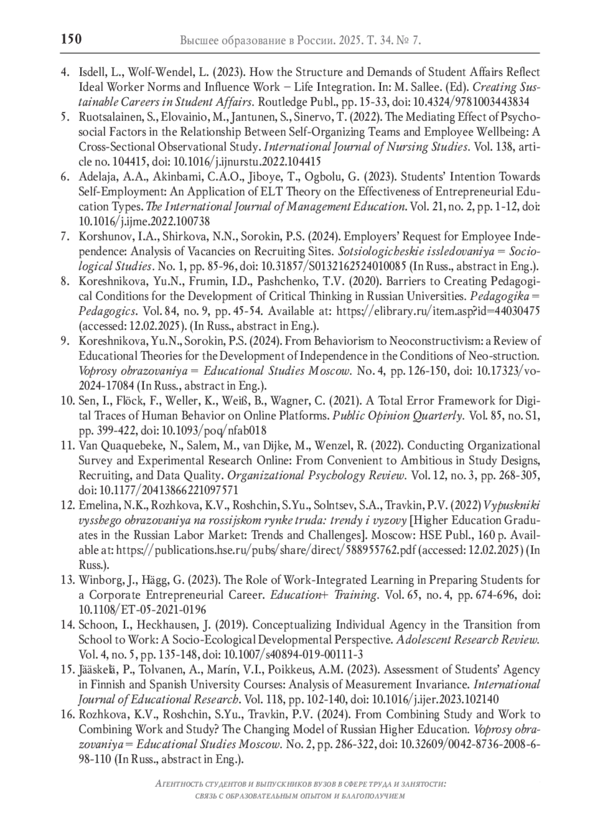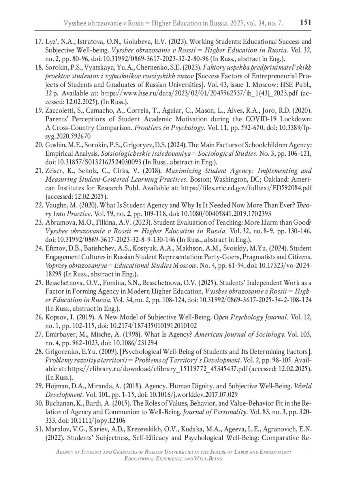 17. Лызь Н.А., Истратова О.Н., Голубева Е.В. Работающие студенты: образовательная успешность и субъективное благополучие? // Высшее образование в России. 2023. Т. 32. № 2. С. 80-96. DOI: 10.31992/0869-3617-2023-32-2-80-96 EDN: MIUEJS