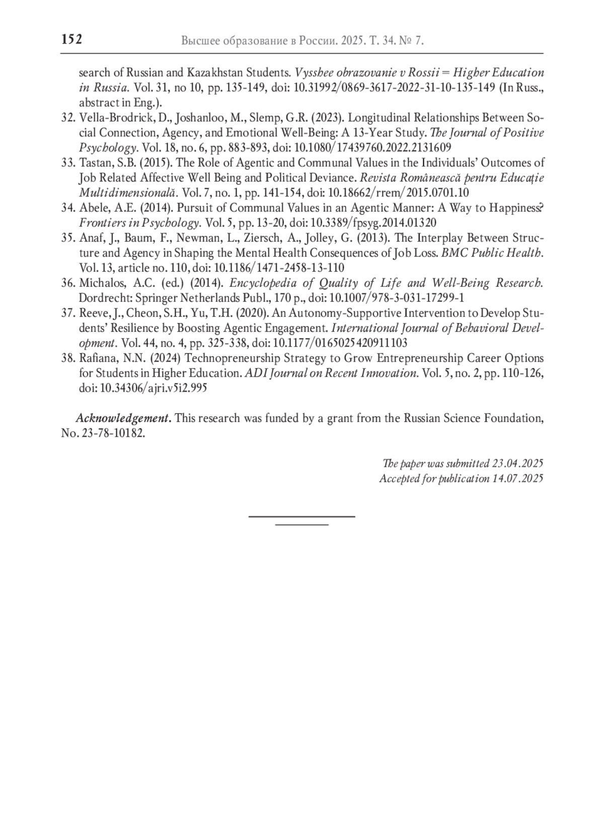 34. Abele A. E. Pursuit of communal values in an agentic manner: a way to happiness? // Frontiers in psychology. 2014. Vol. 5. P. 13-20. DOI: 10.3389/fpsyg.2014.01320