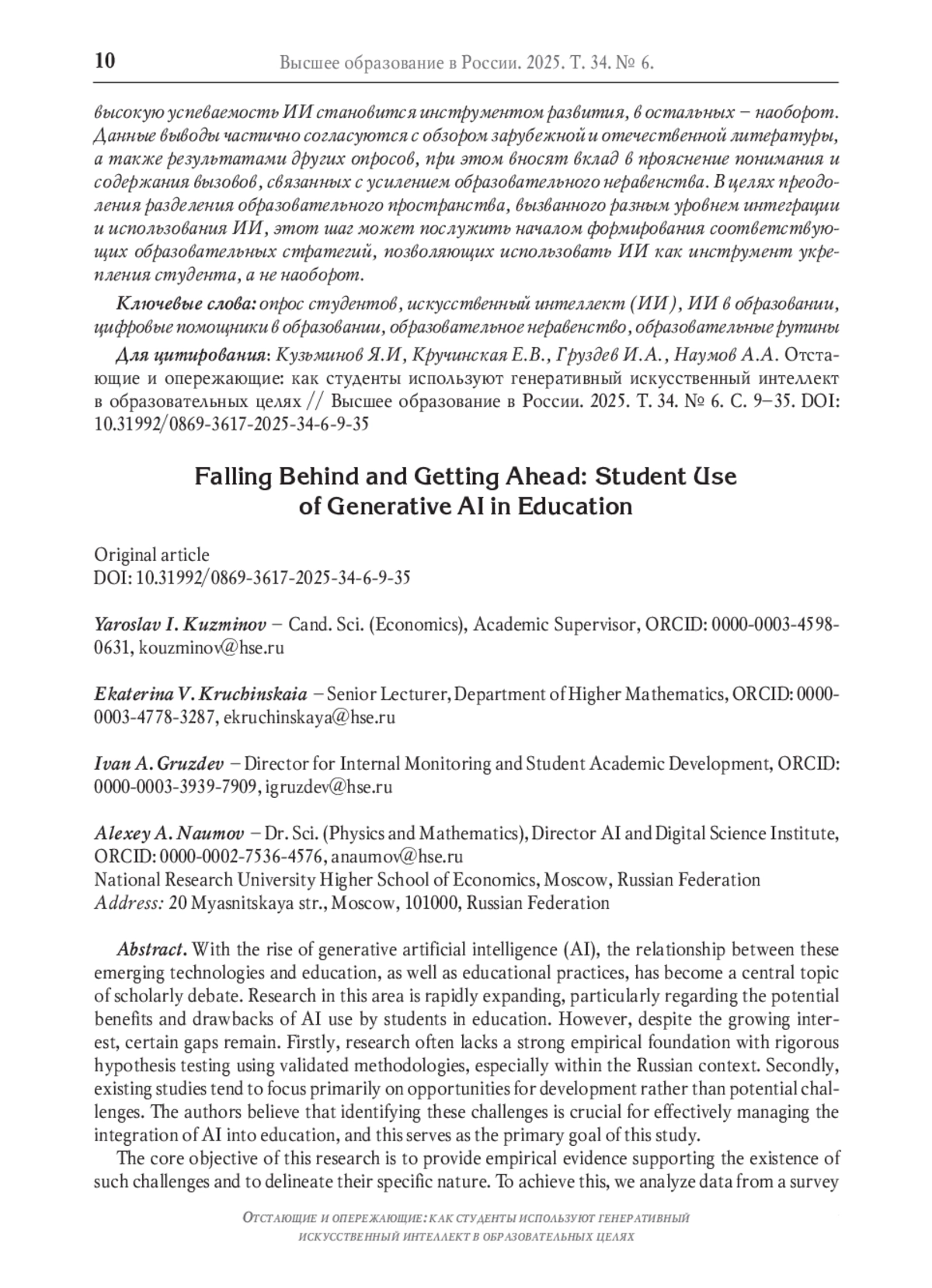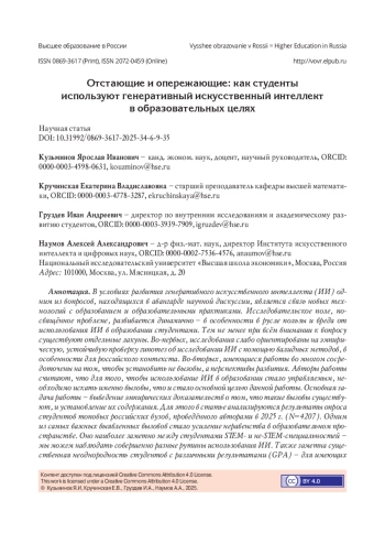 1. Казакова Е.И., Кузьминов Я.И. Мы должны воспитать культуру критического отношения к ответам искусственного интеллекта // Вопросы образования. 2025. № 1. С. 8-24. DOI: 10.17323/vo-2025-25882