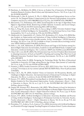 52. Xiao L., Pyng H.S, Ayub A.F. M., Zhu Z., Gao J., Qing Z. University Students’ Usage of Generative Artificial Intelligence for Sustainability: A Cross-Sectional Survey from China // Sustainability. 2025. Vol. 17. No. 8. Article no. 3541. DOI: 10.3390/su17083541 EDN: JQBULA
