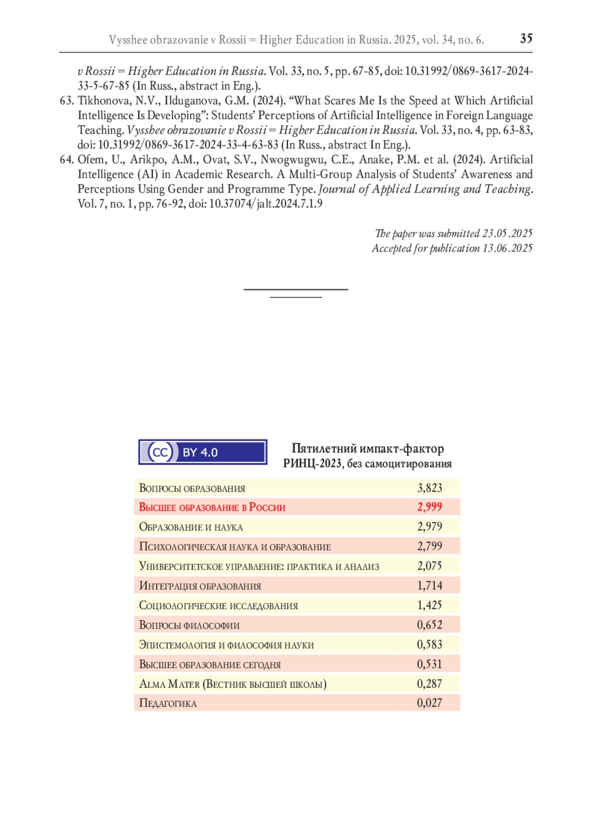64. Ofem U., Arikpo А.М., Ovat S.V., Nwogwugwu С.E., Anake Р.М. et al. Artificial Intelligence (AI) in academic research. A multi-group analysis of students’ awareness and perceptions using gender and programme type // Journal of Applied Learning and Teaching. 2024. Vol. 7. No. 1. Р. 76-92. DOI: 10.37074/jalt.2024.7.1.9 EDN: FDPKDP