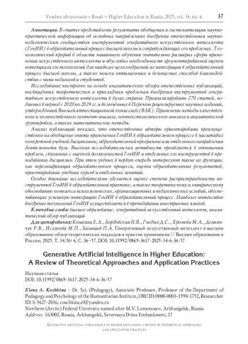 В статье представлены результаты обобщения и систематизации научно-практической информации об основных направлениях внедрения отечественным научно-педагогическим сообществом инструментов генеративного искусственного интеллекта (ГенИИ) в образовательный процесс высшей школы и сопровождающих его проблемах. Технологический прорыв в области машинного обучения значительно расширил сферы применения искусственного интеллекта и обусловил необходимость аргументированной оценки потенциала его технологий для наиболее целесообразной их интеграции в образовательный процесс высшей школы, а также поиска оптимальных и безопасных способов взаимодействия с ними педагогов и студентов. Исследование построено на основе аналитического обзора отечественных публикаций, посвящённых теоретическим и прикладным проблемам внедрения инструментов генеративного искусственного интеллекта в вузах страны. Проанализированы 270 статей, изданных в период с 2020 по 2024 гг. и включённых в Перечень рецензируемых научных изданий, утверждённый Высшей аттестационной комиссией (ВАК). Применены методы качественного и количественного контент-анализа, контекстологического анализа и аналитической группировки, а также математические методы. Анализ публикаций показал, что отечественные авторы ориентированы преимущественно на обобщение опыта применения ГенИИ в образовательном процессе в масштабах конкретной учебной дисциплины, образовательной программы или отдельного направления деятельности вуза. Высокая исследовательская активность проявляется в отношении проблем, связанных с оценкой возможностей ГенИИ и отдельных его инструментов в преподавании дисциплин. При этом учёных в первую очередь интересуют такие их функции, как персонификация образовательного процесса, оценка образовательных результатов, проектирование учебных курсов и отдельных занятий. Особое внимание исследователями уделяется оценке степени распространённости инструментов ГенИИ в образовательной практике, а также теоретическому и эмпирическому обоснованию комплекса психологических, организационных и педагогических условий, обеспечивающих успешную интеграцию ГенИИ в образовательный процесс. Наиболее интенсивно внедрение технологий ГенИИ осуществляется в преподавании иностранных языков.