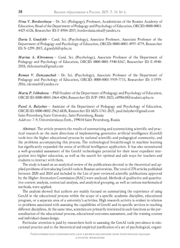 39. Андреева А.А., Тучкевич Е.И. Три задачи преподавателя высшей школы, решаемых с помощью ИИ // Kant. 2024. № 3 (52). С. 274-276. DOI: 10.24923/2222-243X.2024-52.44 EDN: TYPLSI