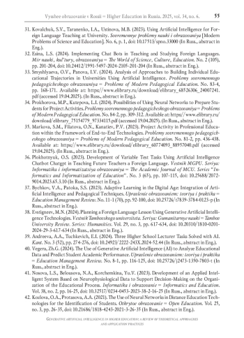 15. Пятко Л.А., Стародумова Л.А. К вопросу об использовании технологий искусственного интеллекта в образовательном процессе // Проблемы современного педагогического образования. 2024. № 83-2. С. 331-334. EDN: EKKDJQ