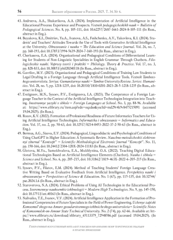 45. Черкасова Е.А. Организационно-педагогические условия дифференцированного обучения студентов нелингвистических направлений подготовки грамматике английского языка посредством чат-ботов // Филологические науки. Вопросы теории и практики. 2024. Т. 17. № 3. С. 828-833. DOI: 10.30853/phil20240118 EDN: JAIZOU