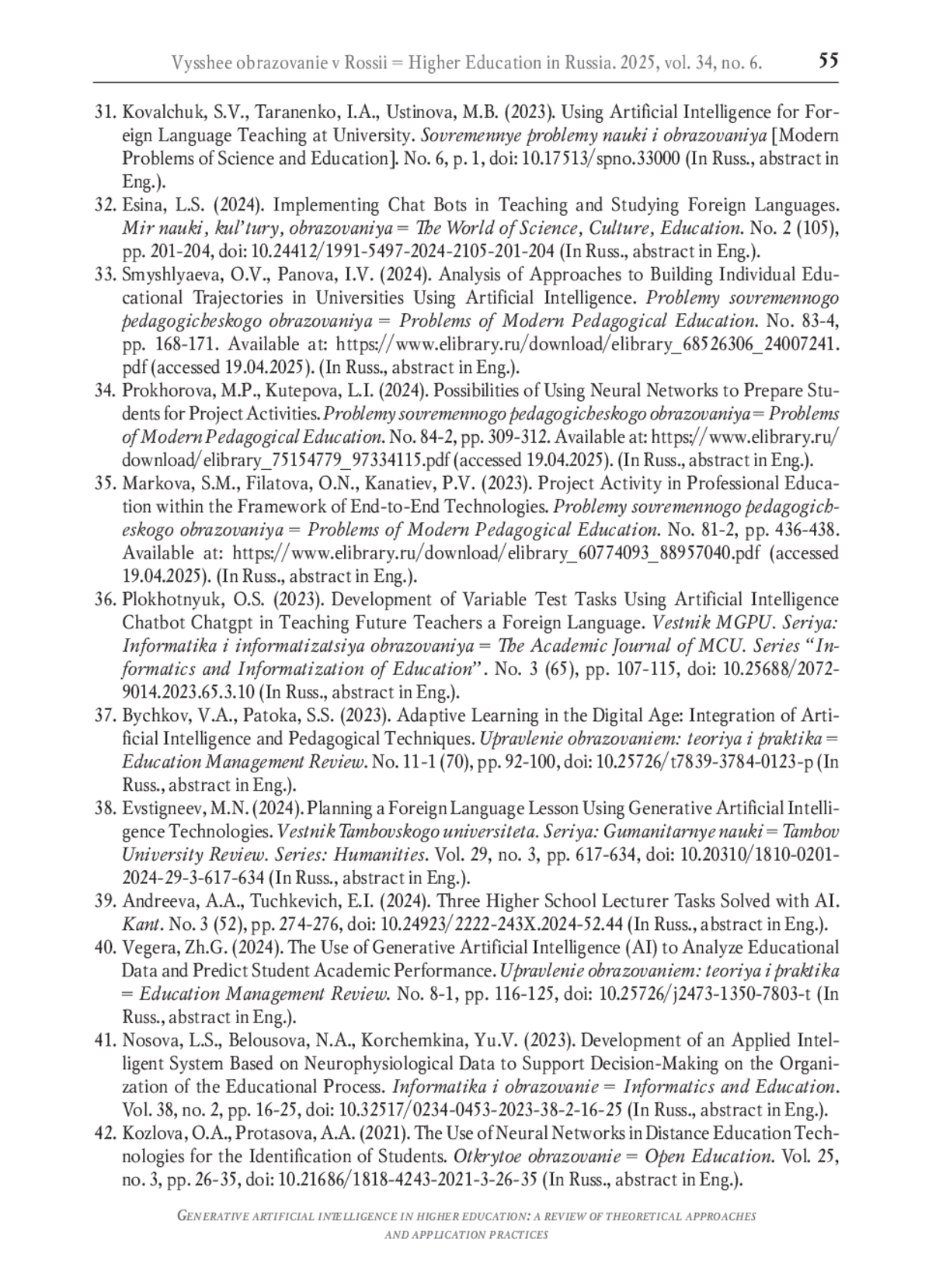 31. Ковальчук С.В., Тараненко И.А., Устинова М.Б. Применение искусственного интеллекта для обучения иностранному языку в вузе // Современные проблемы науки и образования. 2023. № 6. С. 1. DOI: 10.17513/spno.33000 EDN: BARODP