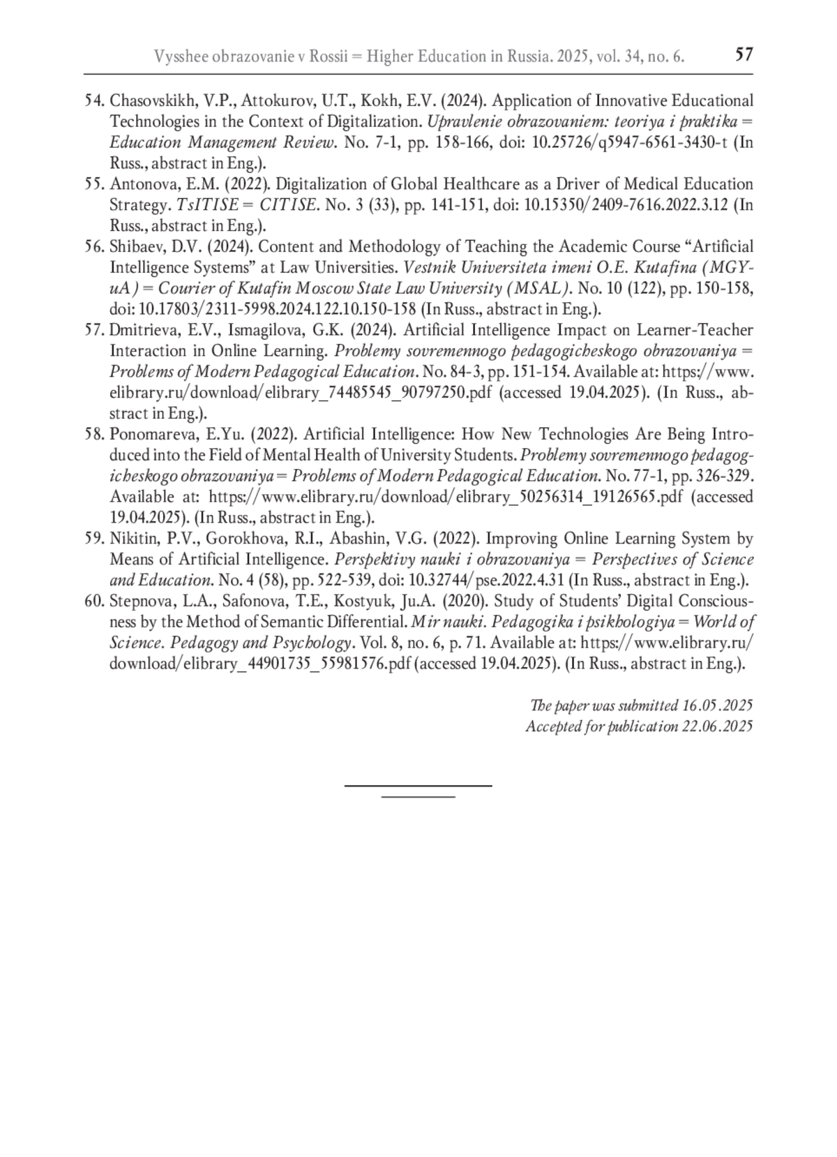 57. Дмитриева Е.В., Исмагилова Г.К. Влияние искусственного интеллекта на взаимодействие обучающегося и преподавателя в онлайн-обучении // Проблемы современного педагогического образования. 2024. № 84-3. С. 151-154. EDN: REIIWD