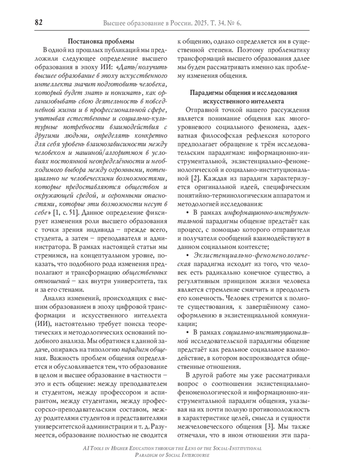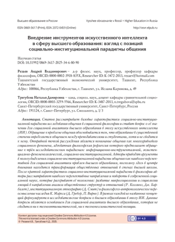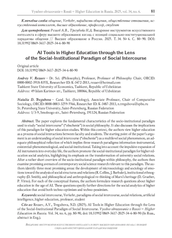Статья рассматривает базовые характеристики социально-институциональной парадигмы исследования общения в социальной философии и ставит вопрос о её значении для социальной аналитики высшего образования в эпоху искусственного интеллекта (ИИ). Обращение к проблеме общения обосновывается тем, что образование в существенной степени определяется общением между преподавателями и студентами, хотя и не сводится к нему. Отправной точкой рассуждения является понимание общения как многоуровневого социального феномена, адекватная философская рефлексия которого предполагает обращение к трём исследовательским парадигмам: информационно-инструментальной, экзистенциально-феноменологической, социально-институциональной. Авторы приводят аргументы в пользу выделения социально-институциональной парадигмы общения как наиболее перспективной для социальной аналитики проблем высшего образования, поскольку здесь в центре внимания находится трансформация общественных отношений в стенах высшей школы. После краткой характеристики социально-институциональной парадигмы в философии авторы рассматривают наиболее перспективные направления и повороты в современной социальной науке, которые раскрывают её положения: развитие микросоциологии и социологии эмоций в направлении анализа общественных структур и отношений (Р. Коллинз, Дж. Барбалет), институциональную этнографию (Д. Смит) и философско-антропологическое переосмысление наследия К. Маркса (Д. Гребер, П. Вирно). В рамках каждой из названных концепций формулируются исследовательские вопросы о высшем образовании в эпоху ИИ. Данные вопросы являются основанием для социальной аналитики высшего образования, которая не сводится ни к технооптимистической, ни к технопессимистической позиции.