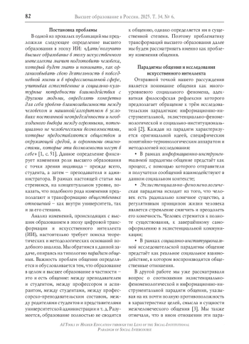 Чем типология парадигм общения может быть полезна для понимания процессов внедрения инструментов ИИ в высшее образование? Суть дела в том, что философские предпосылки, на которых основываются те, кто разрабатывает и осмысляет технологии ИИ, непосредственным образом соотносятся со взглядами на человека и общество, которые представляет каждая из парадигм [4].