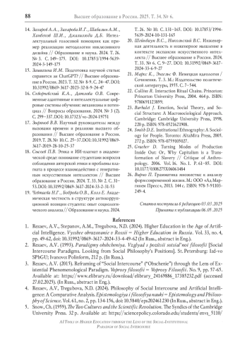 1. Резаев А.В., Степанов А.М., Трегубова Н.Д. Высшее образование в эпоху искусственного интеллекта // Высшее образование в России. 2024. Т. 33. № 4. С. 49-62. DOI: 10.31992/0869-3617-2024-33-4-49-62 EDN: OLNRFA