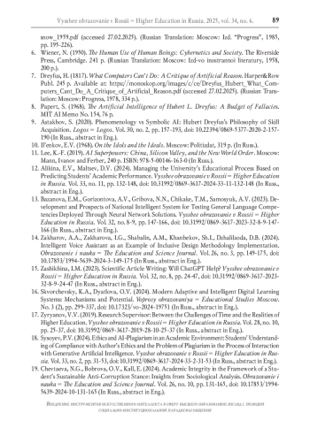 18. Сысоев П.В. Этика и ИИ-плагиат в академической среде: понимание студентами вопросов соблюдения авторской этики и проблемы плагиата в процессе взаимодействия с генеративным искусственным интеллектом // Высшее образование в России. 2024. Т. 33. № 2. С. 31-53. DOI: 10.31992/0869-3617-2024-33-2-31-53 EDN: VTAIUO