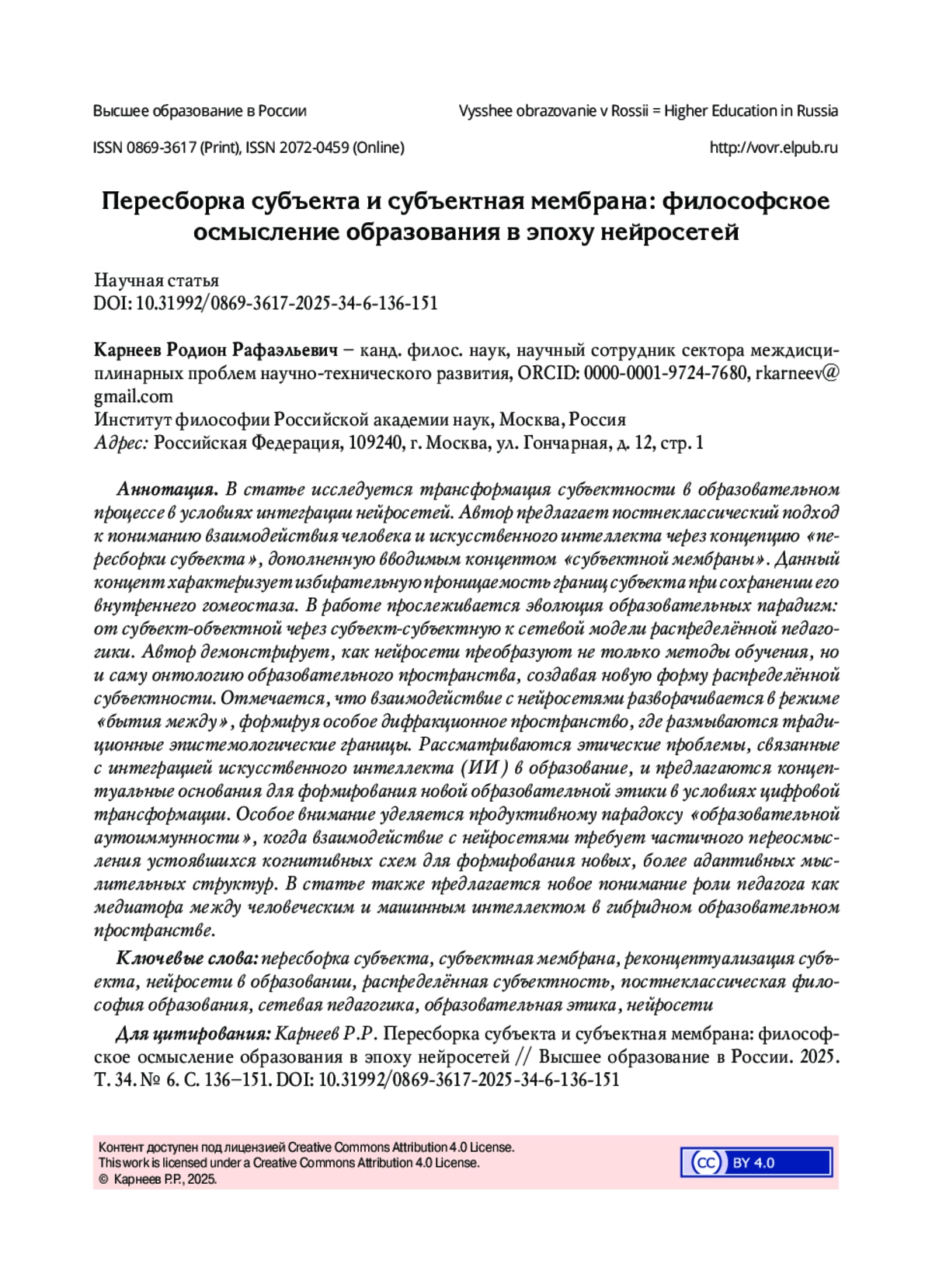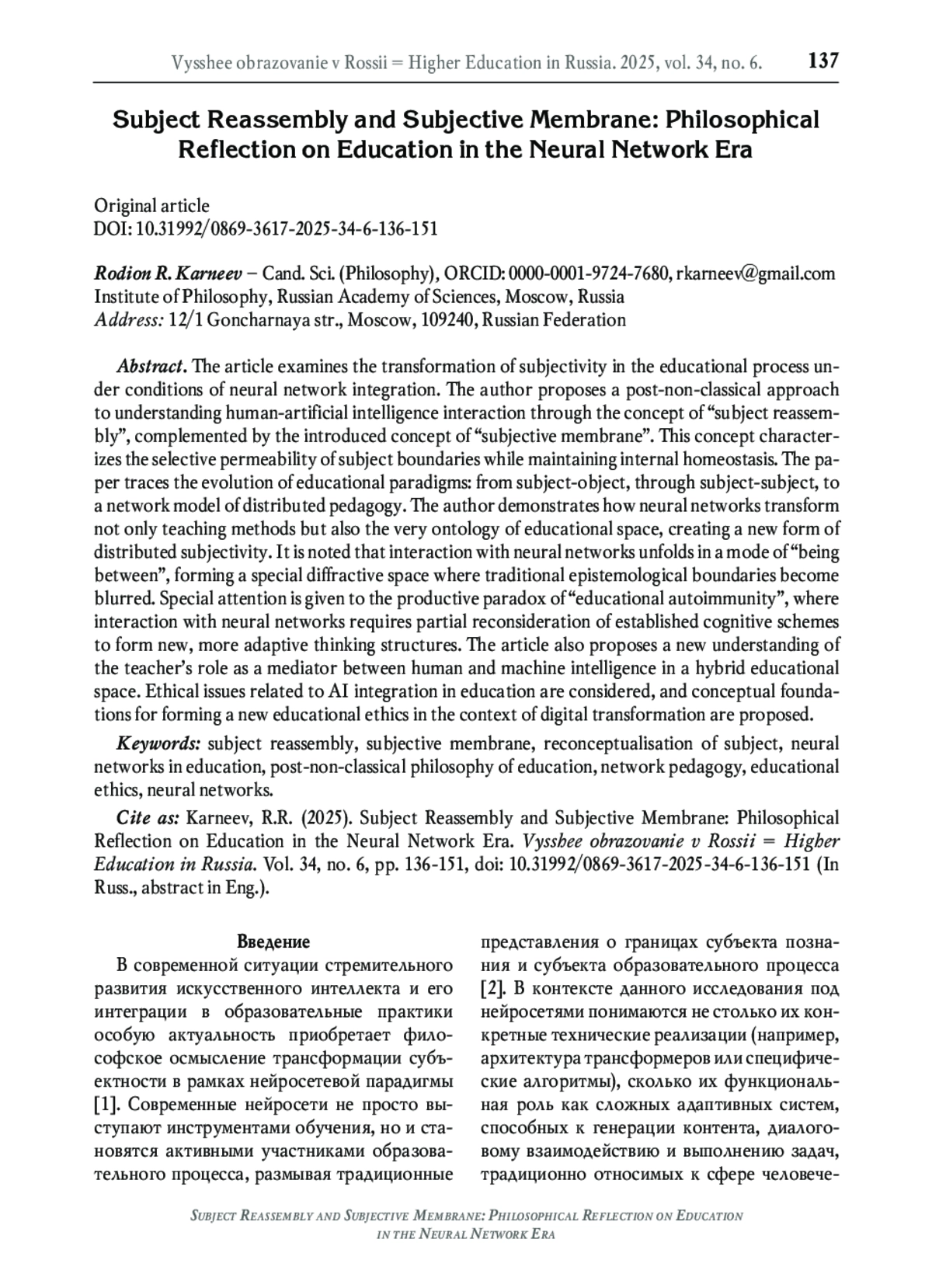 В статье исследуется трансформация субъектности в образовательном процессе в условиях интеграции нейросетей. Автор предлагает постнеклассический подход к пониманию взаимодействия человека и искусственного интеллекта через концепцию «пересборки субъекта», дополненную вводимым концептом «субъектной мембраны». Данный концепт характеризует избирательную проницаемость границ субъекта при сохранении его внутреннего гомеостаза. В работе прослеживается эволюция образовательных парадигм: от субъект-объектной через субъект-субъектную к сетевой модели распределённой педагогики. Автор демонстрирует, как нейросети преобразуют не только методы обучения, но и саму онтологию образовательного пространства, создавая новую форму распределённой субъектности. Отмечается, что взаимодействие с нейросетями разворачивается в режиме «бытия между», формируя особое дифракционное пространство, где размываются традиционные эпистемологические границы. Рассматриваются этические проблемы, связанные с интеграцией искусственного интеллекта (ИИ) в образование, и предлагаются концептуальные основания для формирования новой образовательной этики в условиях цифровой трансформации. Особое внимание уделяется продуктивному парадоксу «образовательной аутоиммунности», когда взаимодействие с нейросетями требует частичного переосмысления устоявшихся когнитивных схем для формирования новых, более адаптивных мыслительных структур. В статье также предлагается новое понимание роли педагога как медиатора между человеческим и машинным интеллектом в гибридном образовательном пространстве.