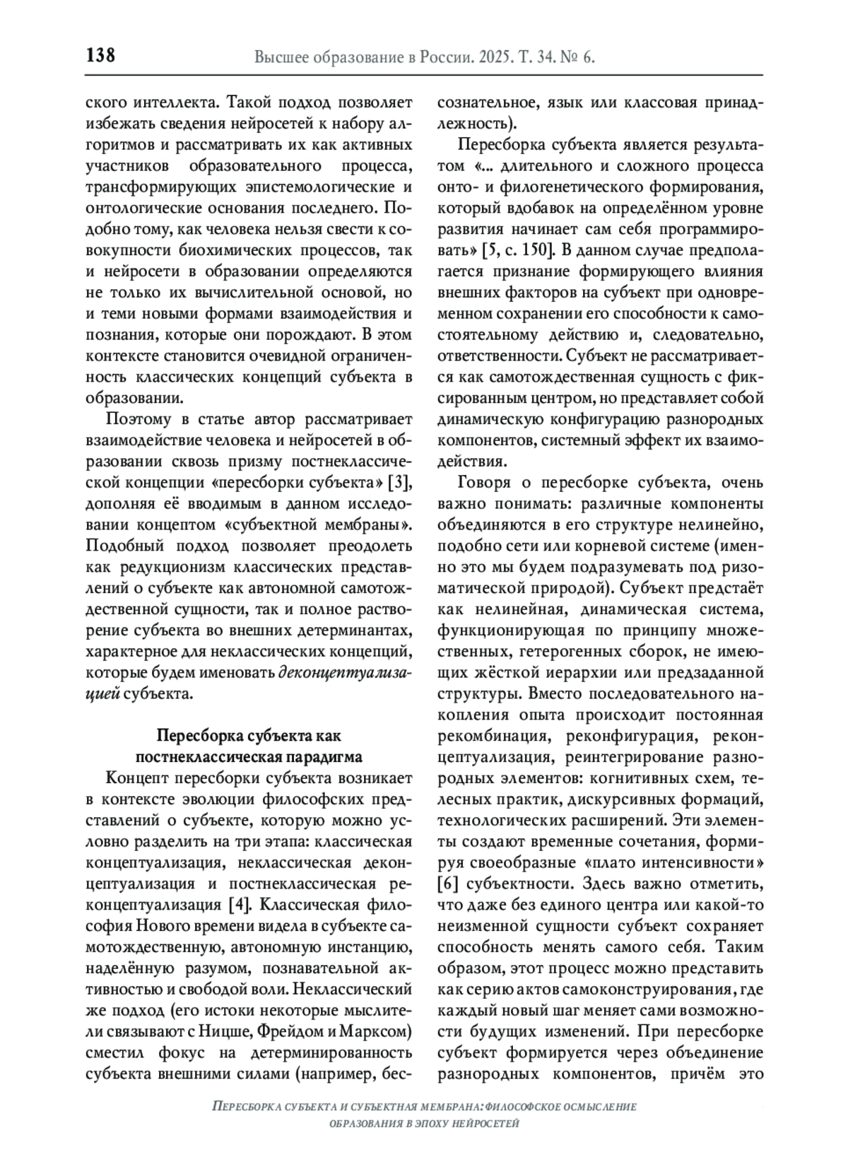 Поэтому в статье автор рассматривает взаимодействие человека и нейросетей в образовании сквозь призму постнеклассической концепции «пересборки субъекта» [3], дополняя её вводимым в данном исследовании концептом «субъектной мембраны». Подобный подход позволяет преодолеть как редукционизм классических представлений о субъекте как автономной самотождественной сущности, так и полное растворение субъекта во внешних детерминантах, характерное для неклассических концепций, которые будем именовать деконцептуализацией субъекта.