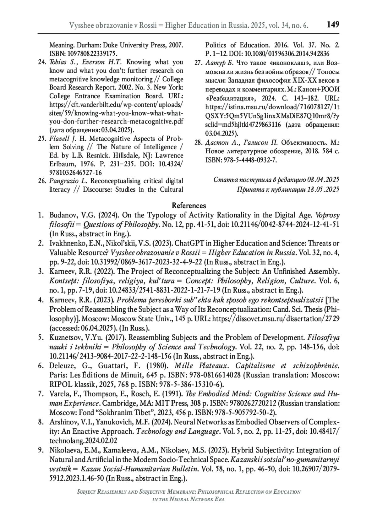 1. Буданов В.Г. О типологии деятельностной рациональности в цифровую эпоху // Вопросы философии. 2024. № 12. С. 41-51. DOI: 10.21146/0042-8744-2024-12-41-51 EDN: JFMJQM
