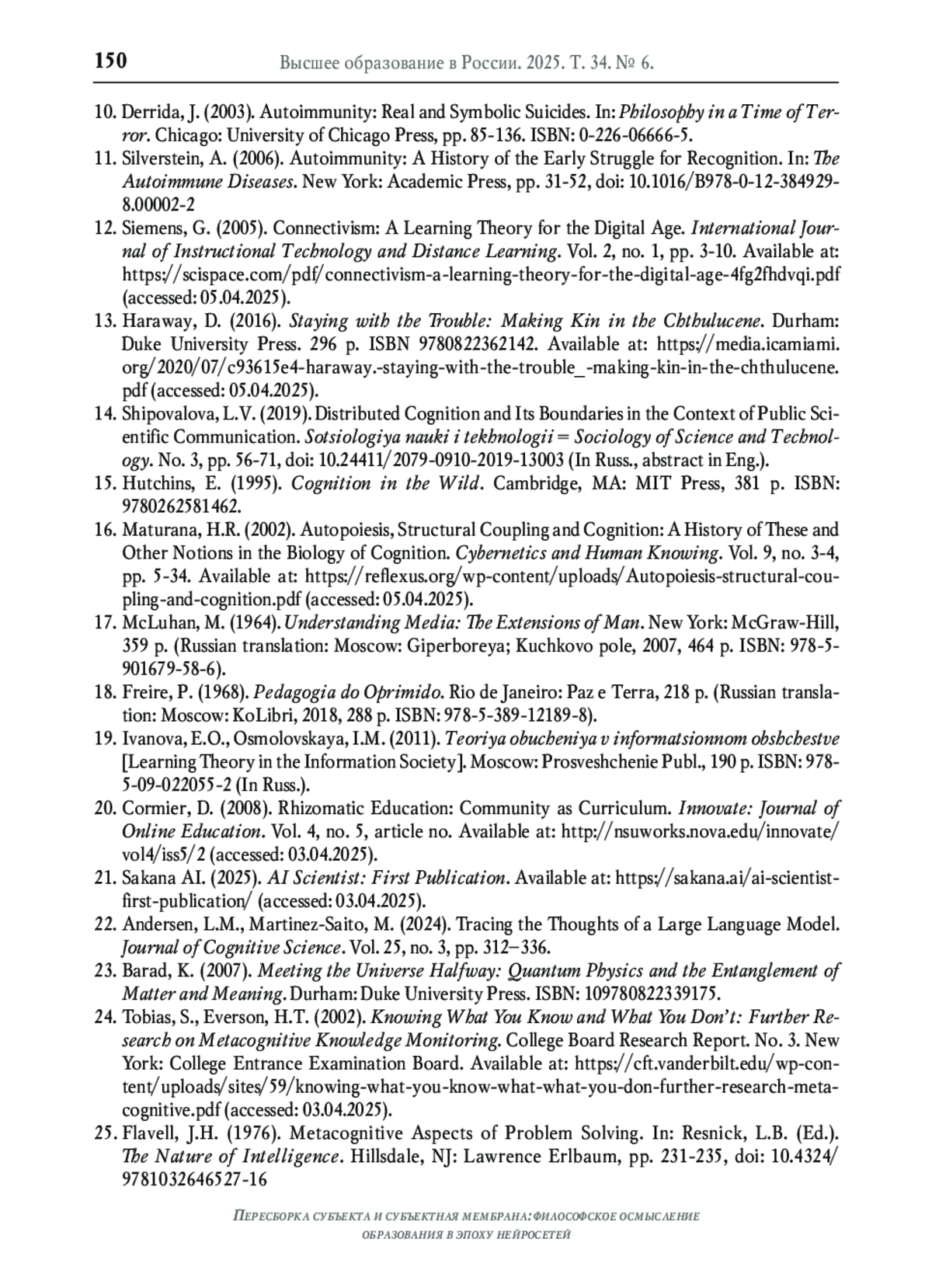 13. Haraway D. Staying with the Trouble: Making Kin in the Chthulucene. Durham: Duke University Press, 2016. 296 p. URL: https://media.icamiami.org/2020/07/c93615e4-haraway.-staying-with-the-trouble_-making-kin-in-the-chthulucene.pdf (дата обращения: 05.04.2025). ISBN: 978-0-8223-6214-2