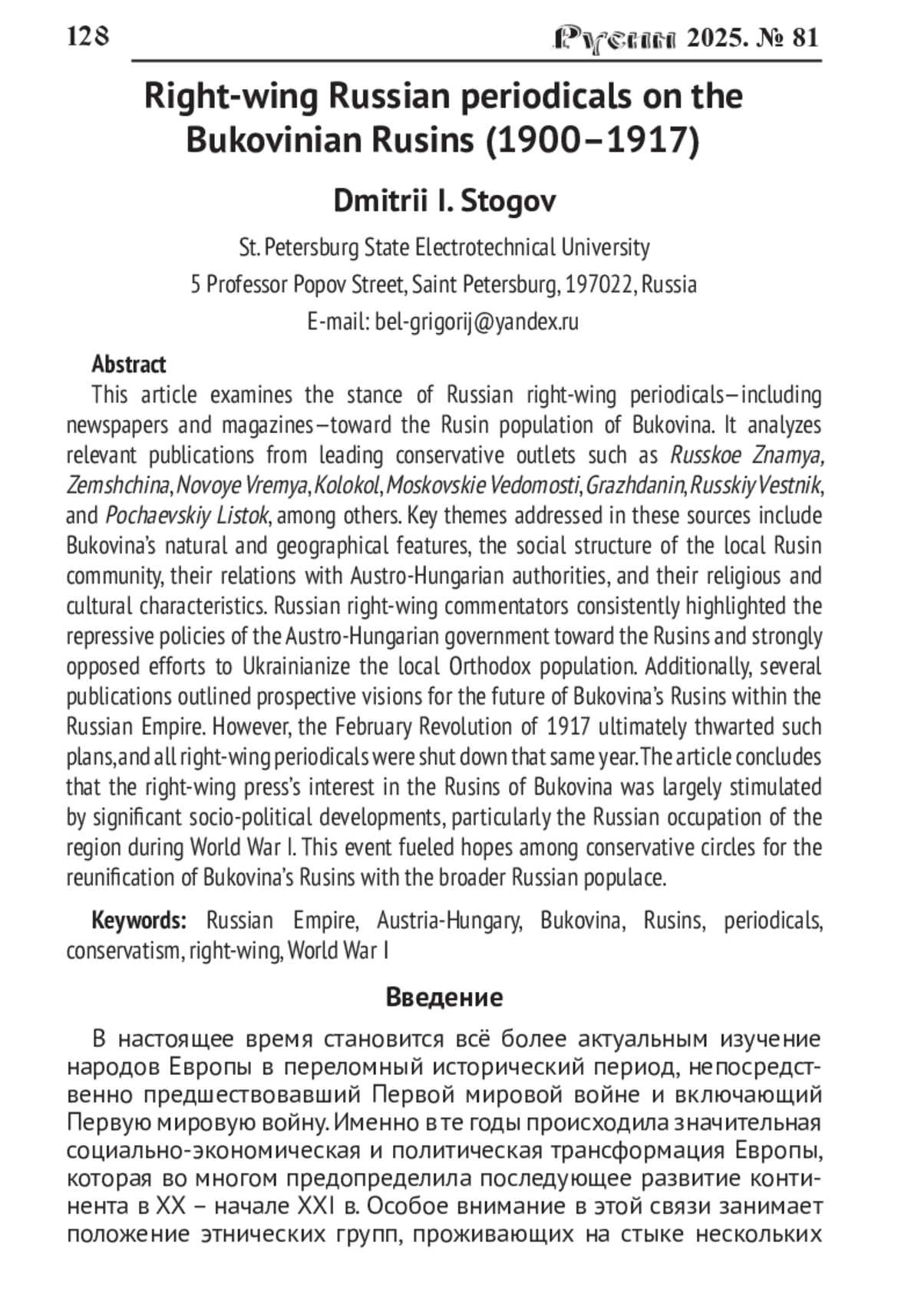 23. Стогов Д.И. Украинский вопрос на страницах русской правой периодической печати (1914 - февраль 1917 г.) // Русин. 2023. № 73. С. 205-220. DOI: 10.17223/18572685/73/13 EDN: ZXXPOQ