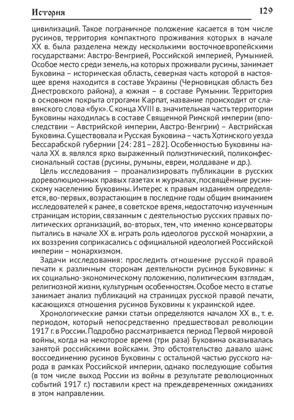 Рассматривается отношение русской периодической печати (газеты, журналы) правого направления к русинскому населению Буковины. Проанализированы публикации, так или иначе касающиеся русинов Буковины, из ведущих правых периодических изданий («Русское знамя», «Земщина», «Новое время», «Колокол», «Московские ведомости», «Гражданин», «Русский вестник», «Почаевский листок» и др.). Выявлены основные сюжеты, которые затрагивались в этих публикациях: природные и географические особенности Буковины, социальная организация местных русинов, взаимоотношения с австро-венгерскими властями, религиозные и культурные особенности русинов Буковины и др. Русские правые публицисты делали акцент на рассмотрении репрессивной политики австро-венгерских властей по отношению к русинам, а также резко осуждали попытки украинизации местного православного населения. Кроме того, на страницах русской правой периодической печати встречались публикации, в которых обрисовывались контуры предполагаемого будущего русинов Буковины в составе Российской империи. Однако последующие события, связанные с Февральской революцией 1917 г., привели к тому, что эти проекты не были реализованы; к тому же в 1917 г. все органы правой периодической печати были закрыты. Делается вывод о том, что интерес к русинскому населению Буковины со стороны правой печати диктовался, прежде всего, важными общественно-политическими событиями, в особенности занятием территории Буковины русскими войсками в период Первой мировой войны, которое предопределило надежды правых на воссоединение русинов с остальной частью русского народа.