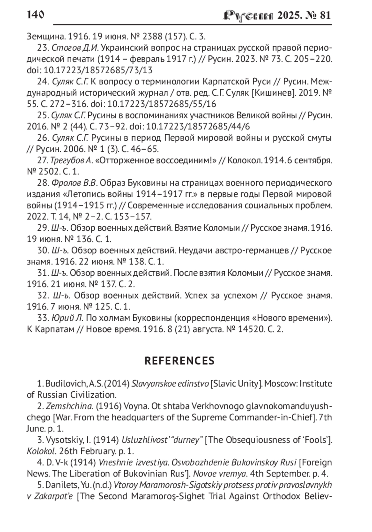 24. Суляк С.Г К вопросу о терминологии Карпатской Руси // Русин. Международный исторический журнал / отв. ред. С.Г Суляк [Кишинев]. 2019. № 55. C. 272-316. DOI: 10.17223/18572685/55/16 EDN: HIIISN