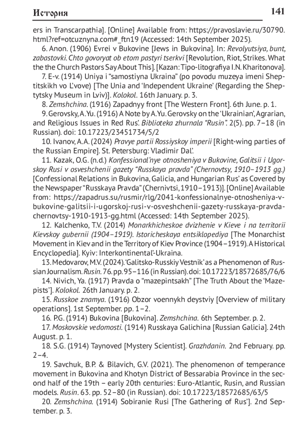 19. Савчук Б.П., Билавич Г.В. Феномен движения трезвости в Буковине и Хотинском уезде Бессарабской губернии во второй половине ХIХ - начале ХХ в.: евроатлантическая, русинская, российская модели // Русин. 2021. № 63. С. 52-80. DOI: 10.17223/18572685/63/5 EDN: MVSSCX