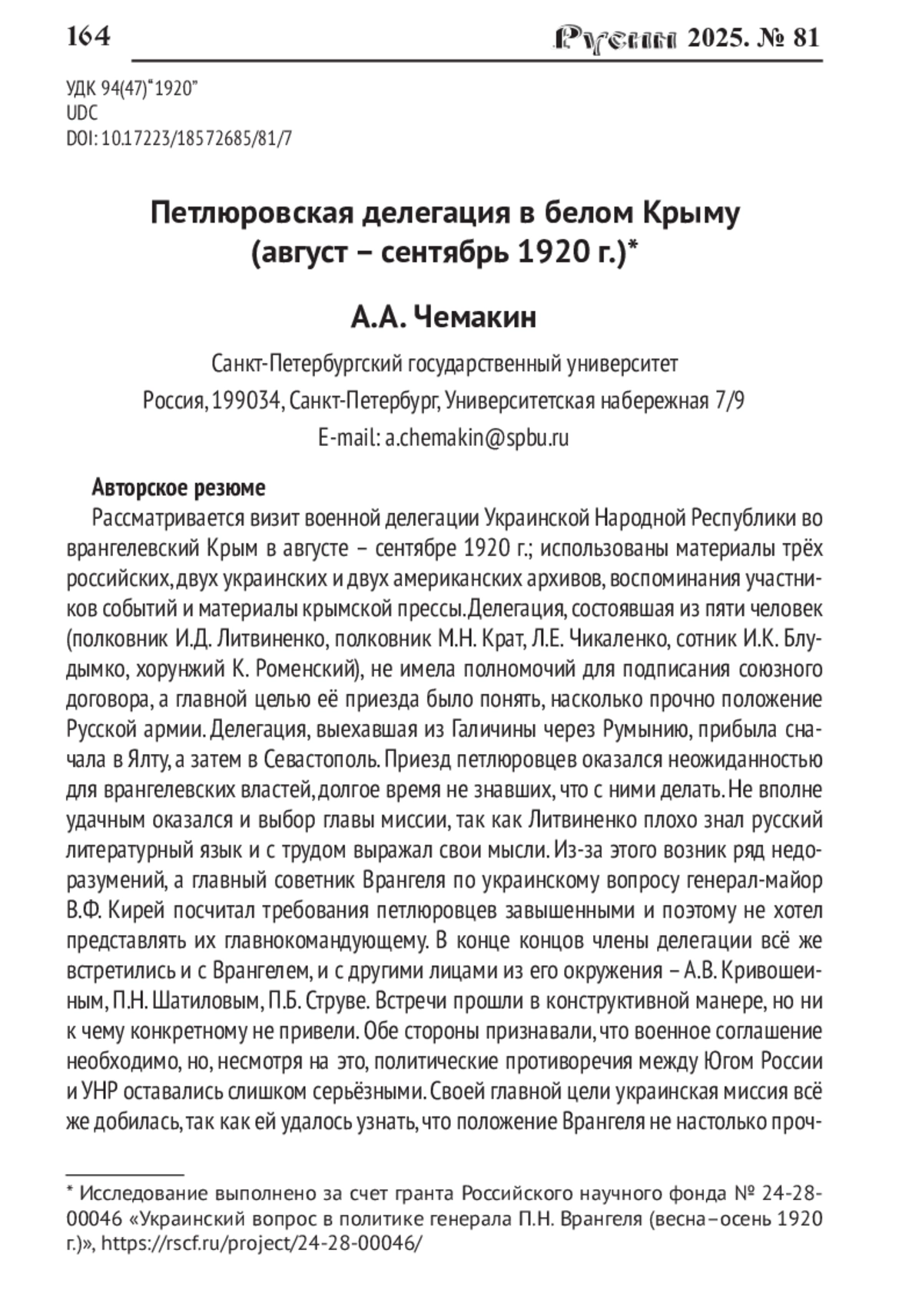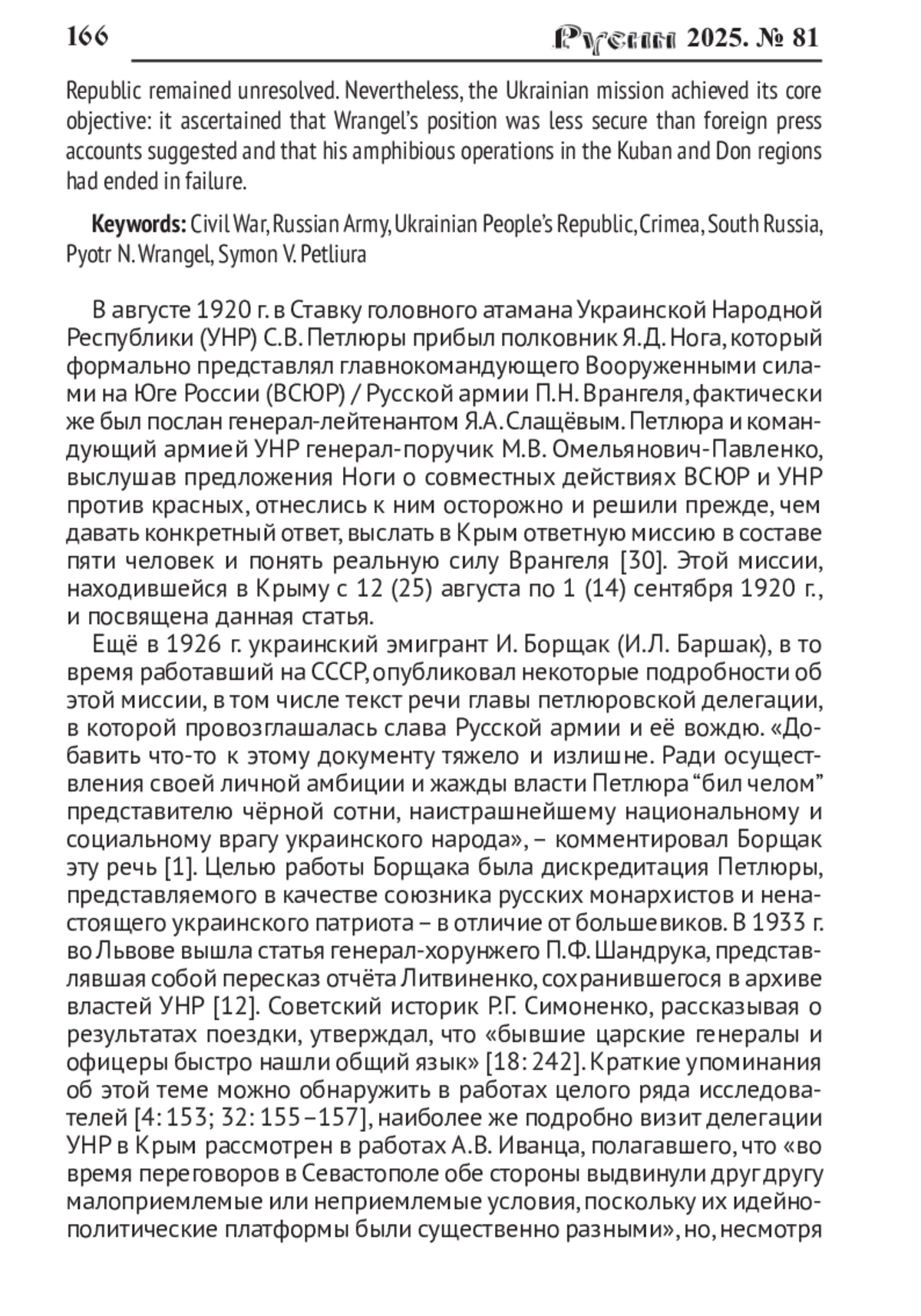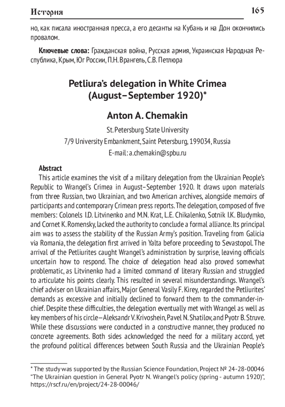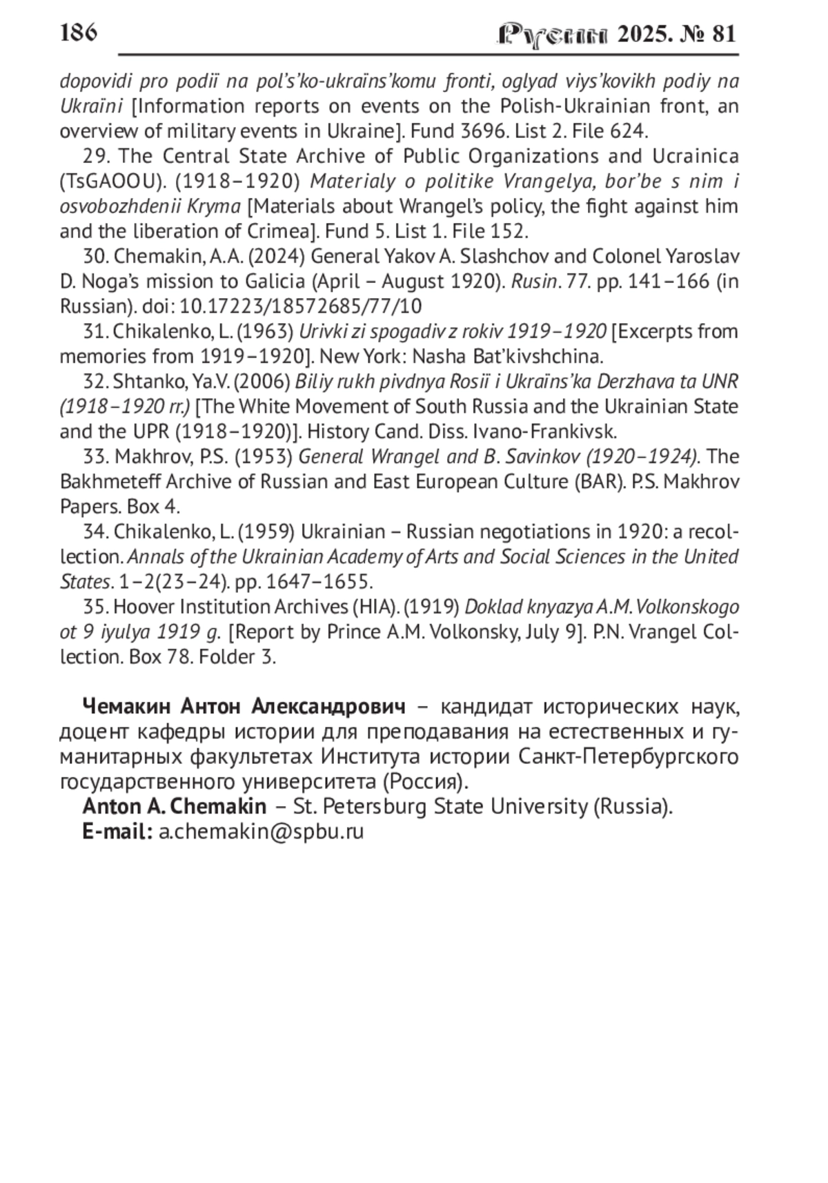 30. Чемакин А.А. Генерал Я.А. Слащёв и миссия полковника Я.Д. Ноги в Галичину (апрель - август 1920 г.) // Русин. 2024. № 77. С. 141-166. DOI: 10.17223/18572685/77/10 EDN: LNRCUG
