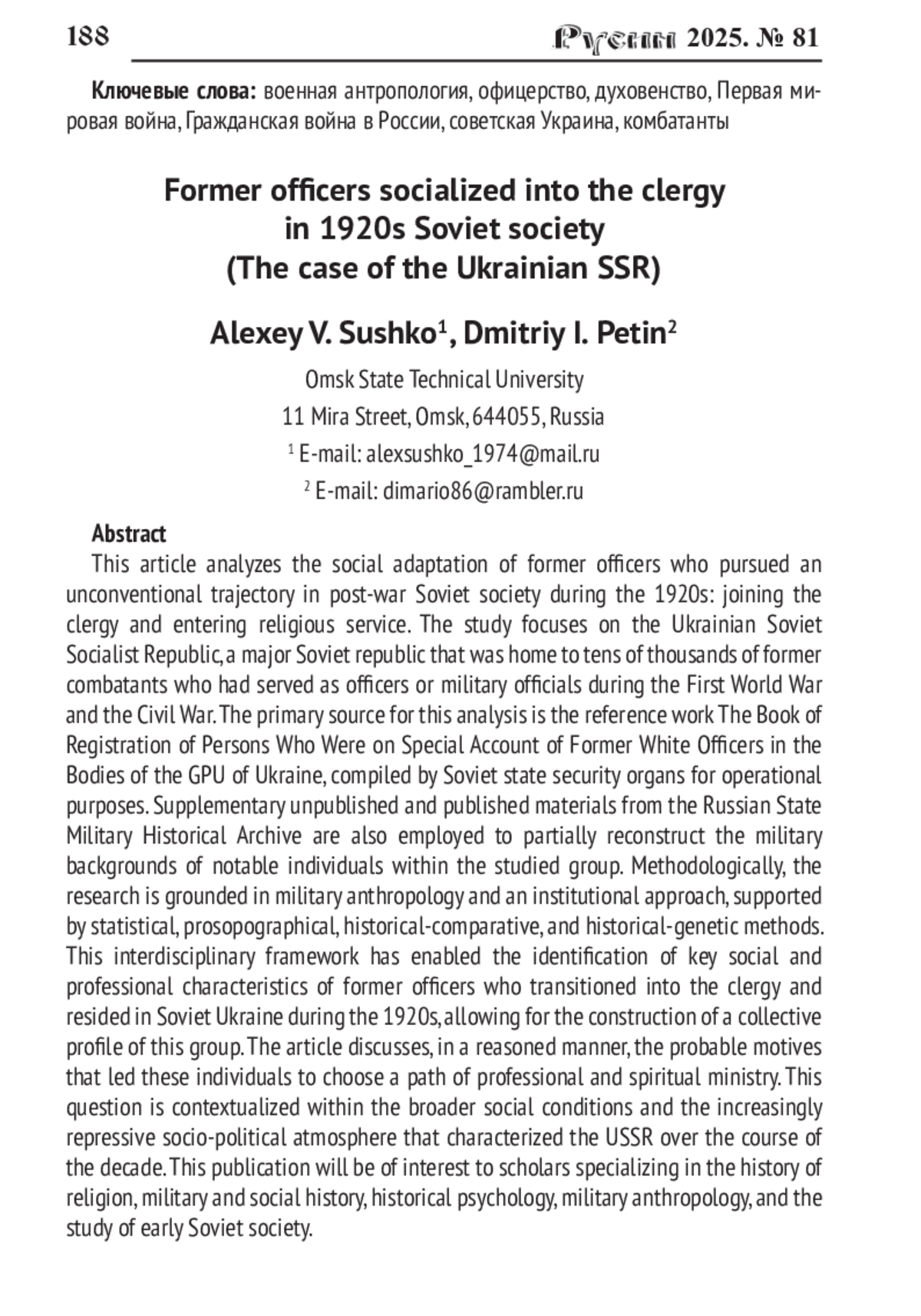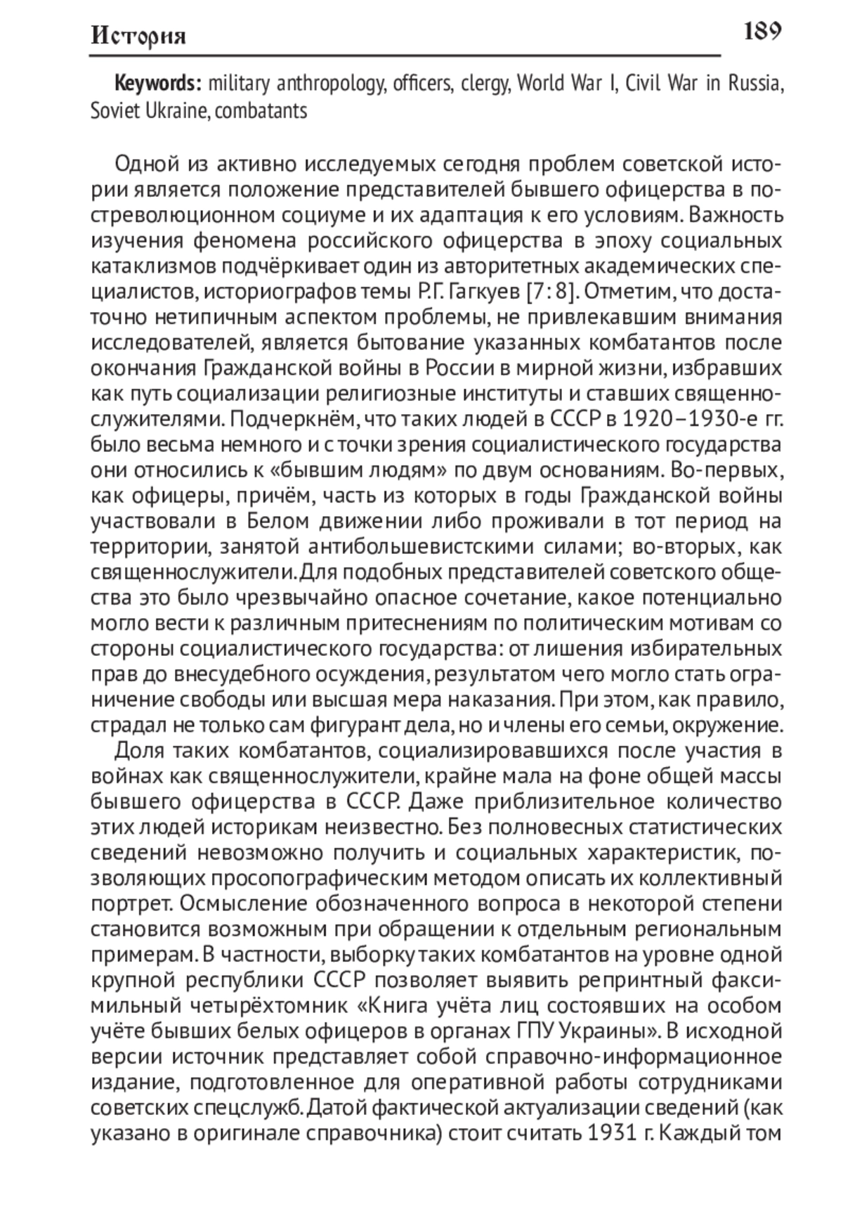 Анализируется вопрос, связанный с социальной адаптацией представителей бывшего офицерства, избравших формой своей поствоенной социализации в советском обществе в 1920-е гг. весьма нетипичный путь - религиозное служение с причислением в духовенство. Проблема исследуется на примере территорий крупного субъекта СССР - Украинской Советской Социалистической Республики, где проживали десятки тысяч комбатантов, являвшихся в период Первой мировой и Гражданской войн офицерами или военными чиновниками. Основой для анализа выступило справочное издание «Книга учёта лиц состоявших на особом учёте бывших белых офицеров в органах ГПУ Украины», подготовленное сотрудниками советских спецслужб для нужд оперативной работы. Также использованы источники (неопубликованные, печатные) из фондов Российского государственного военно-исторического архива, частично иллюстрирующие боевой путь наиболее заметных и показательных представителей изучаемой выборки комбатантов. Военная антропология, институциональный подход, статистический, просопографический, историко-сравнительный и историко-генетический методы составили методологическую основу исследования. Данная теоретическая комбинация позволила выделить некоторые социальные и служебные характеристики бывших офицеров, социализировавшихся в духовенство и живших на территории советской Украины в 1920-е гг., составив на основе полученных сведений коллективный портрет указанной группы лиц. В дискуссионном порядке оговорены вероятные мотивы, побудившие её представителей к выбору такого рода профессионального и одновременно духовного служения. Этот сюжет в исследовании соотнесён с социальными условиями эпохи, а также с ужесточавшейся в СССР в течение 1920-х гг. общественно-политической атмосферой.