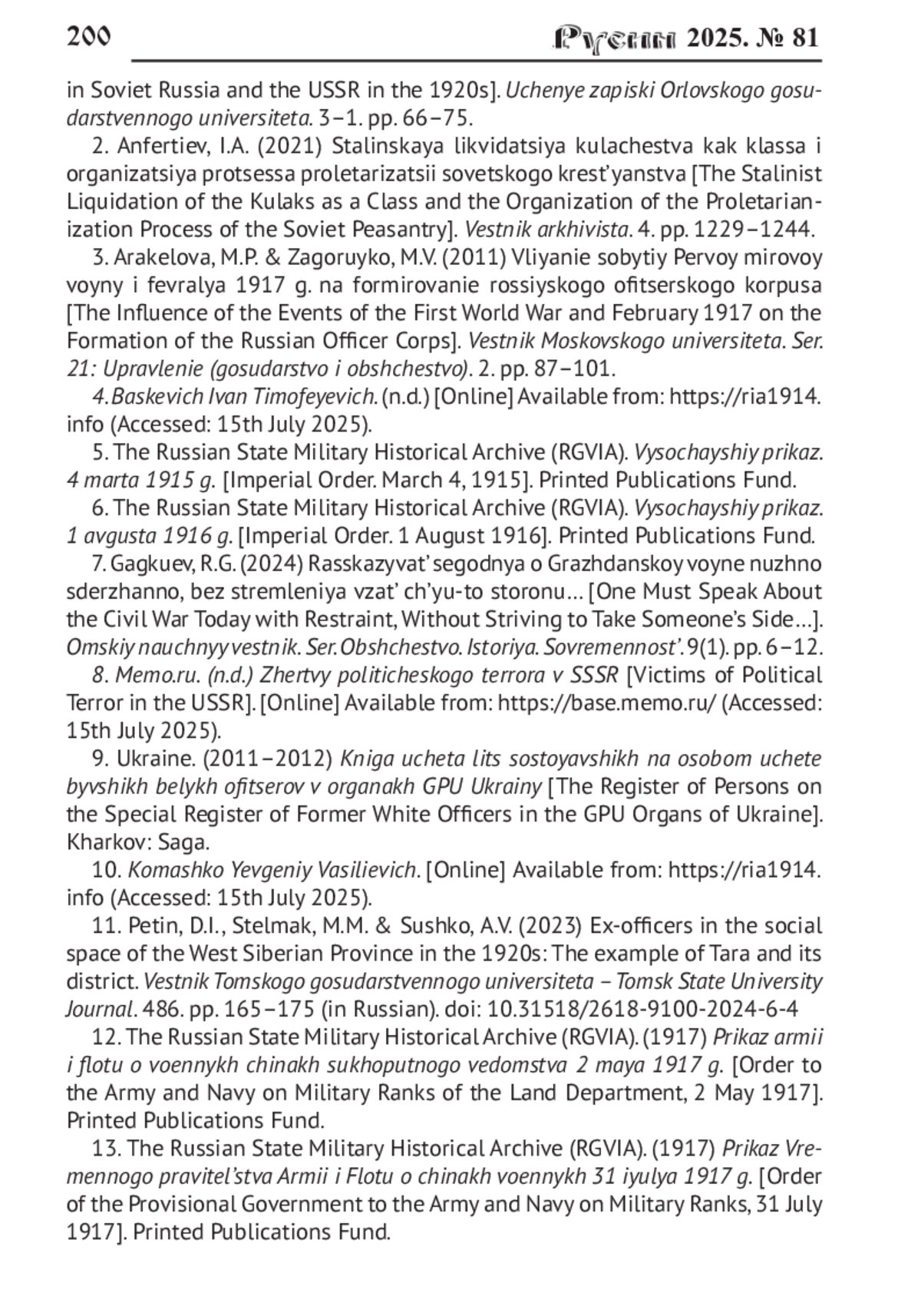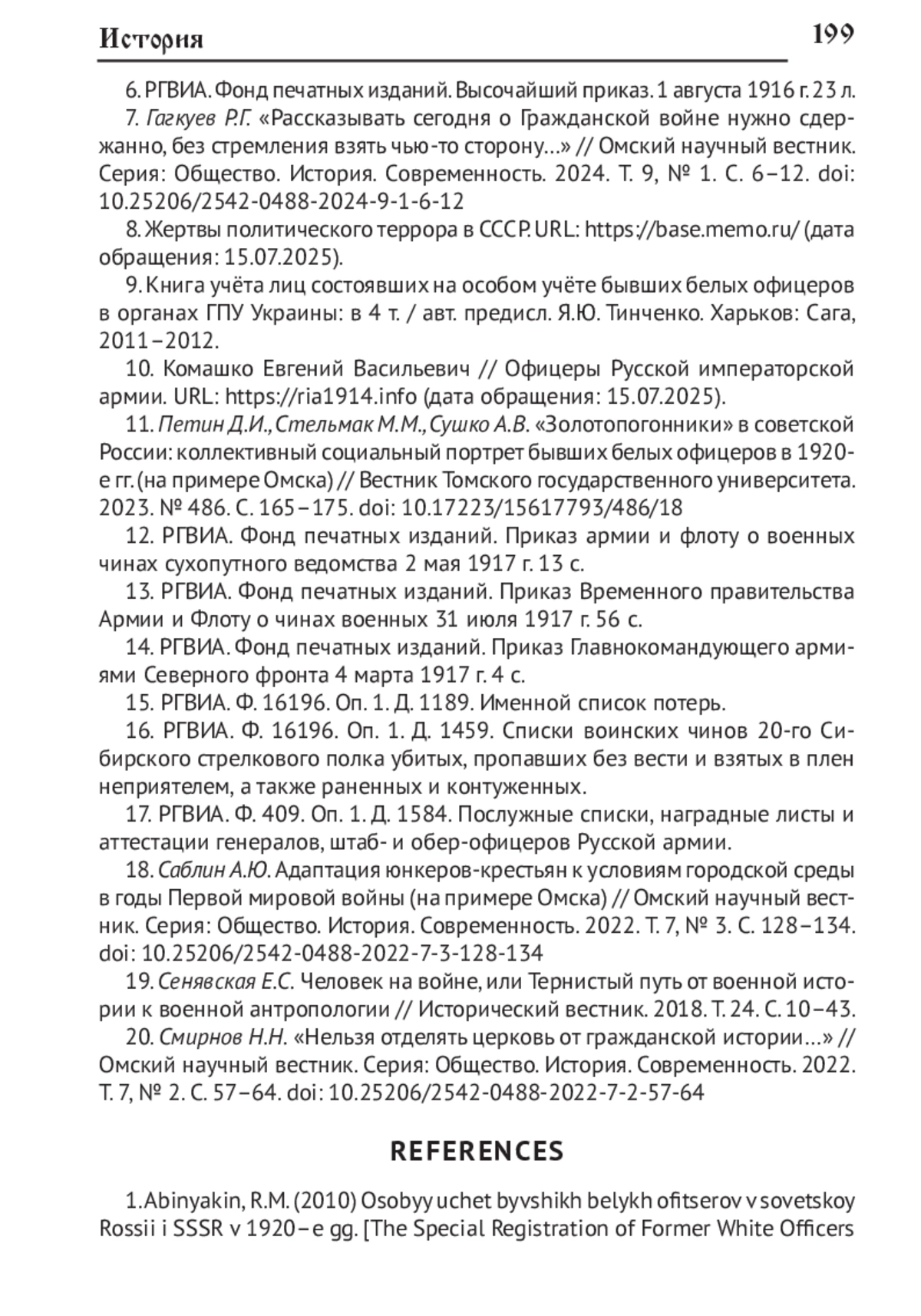 11. Петин Д.И., Стельмак М.М., Сушко А.В. “Золотопогонники” в советской России: коллективный социальный портрет бывших белых офицеров в 1920е гг. (на примере Омска) // Вестник Томского государственного университета. 2023. № 486. С. 165-175. DOI: 10.17223/15617793/486/18 EDN: IWQMWV