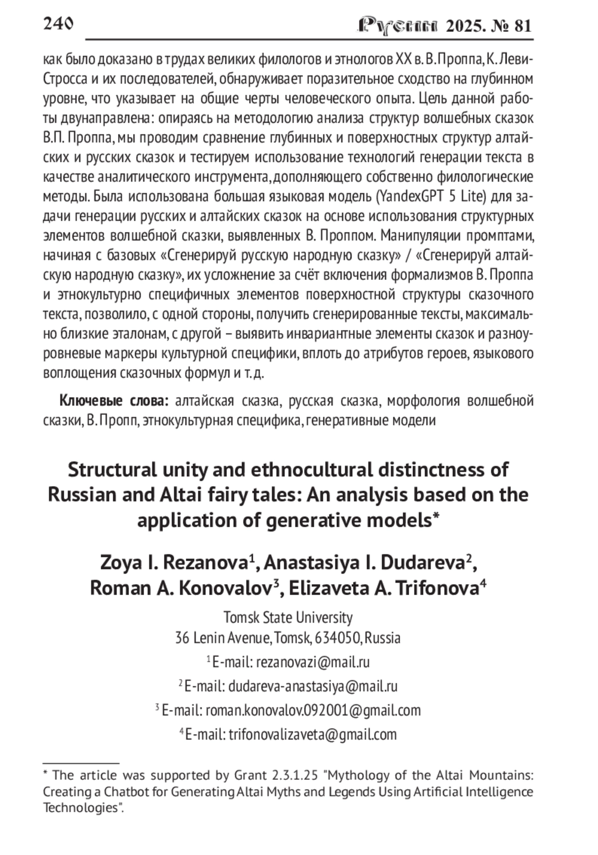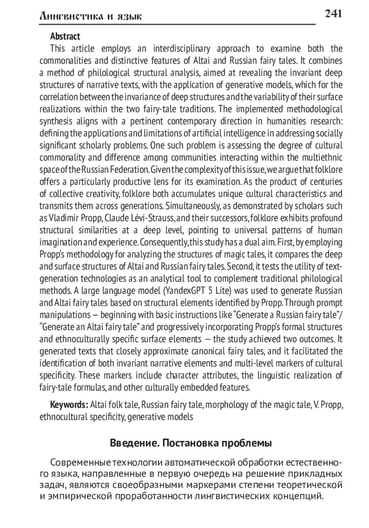 Представлен опыт применения междисциплинарной методологии для выявления общинности и своеобразия фольклорных сказочных текстов - алтайских и русских. В работе метод филологического структурного анализа текстов дополняется использованием генеративных моделей, позволяющих соотнести инвариантность глубинных структур и вариативность поверхностных реализаций русских и алтайских сказок. Реализованный в работе методологический синтез соответствует одному из наиболее актуальных направлений в развитии гуманитарных наук в настоящее время - определению вариантов и границ использования технологий искусственного интеллекта при решении социально значимых гуманитарных проблем. К числу таких проблем, нуждающихся в разработке, по нашему мнению, относится и проблема общности и различия культур, контактирующих в пространствах многоэтничной Российской Федерации. Понимая многоаспектность и сложность проблемы, мы считаем продуктивным обращение при постановке и решении данной проблемы к материалам фольклорных текстов, так как фольклор, будучи результатом многовекового коллективного творчества, аккумулирует и транслирует уникальные черты культуры, в которой он зародился и развивался, и в то же время, как было доказано в трудах великих филологов и этнологов ХХ в. В. Проппа, К. Леви-Стросса и их последователей, обнаруживает поразительное сходство на глубинном уровне, что указывает на общие черты человеческого опыта. Цель данной работы двунаправлена: опираясь на методологию анализа структур волшебных сказок В. П. Проппа, мы проводим сравнение глубинных и поверхностных структур алтайских и русских сказок и тестируем использование технологий генерации текста в качестве аналитического инструмента, дополняющего собственно филологические методы. Была использована большая языковая модель (YandexGPT 5 Lite) для задачи генерации русских и алтайских сказок на основе использования структурных элементов волшебной сказки, выявленных В. Проппом. Манипуляции промптами, начиная с базовых «Сгенерируй русскую народную сказку» / «Сгенерируй алтайскую народную сказку», их усложнение за счёт включения формализмов В. Проппа и этнокультурно специфичных элементов поверхностной структуры сказочного текста, позволило, с одной стороны, получить сгенерированные тексты, максимально близкие эталонам, с другой - выявить инвариантные элементы сказок и разноуровневые маркеры культурной специфики, вплоть до атрибутов героев, языкового воплощения сказочных формул и т. д.
