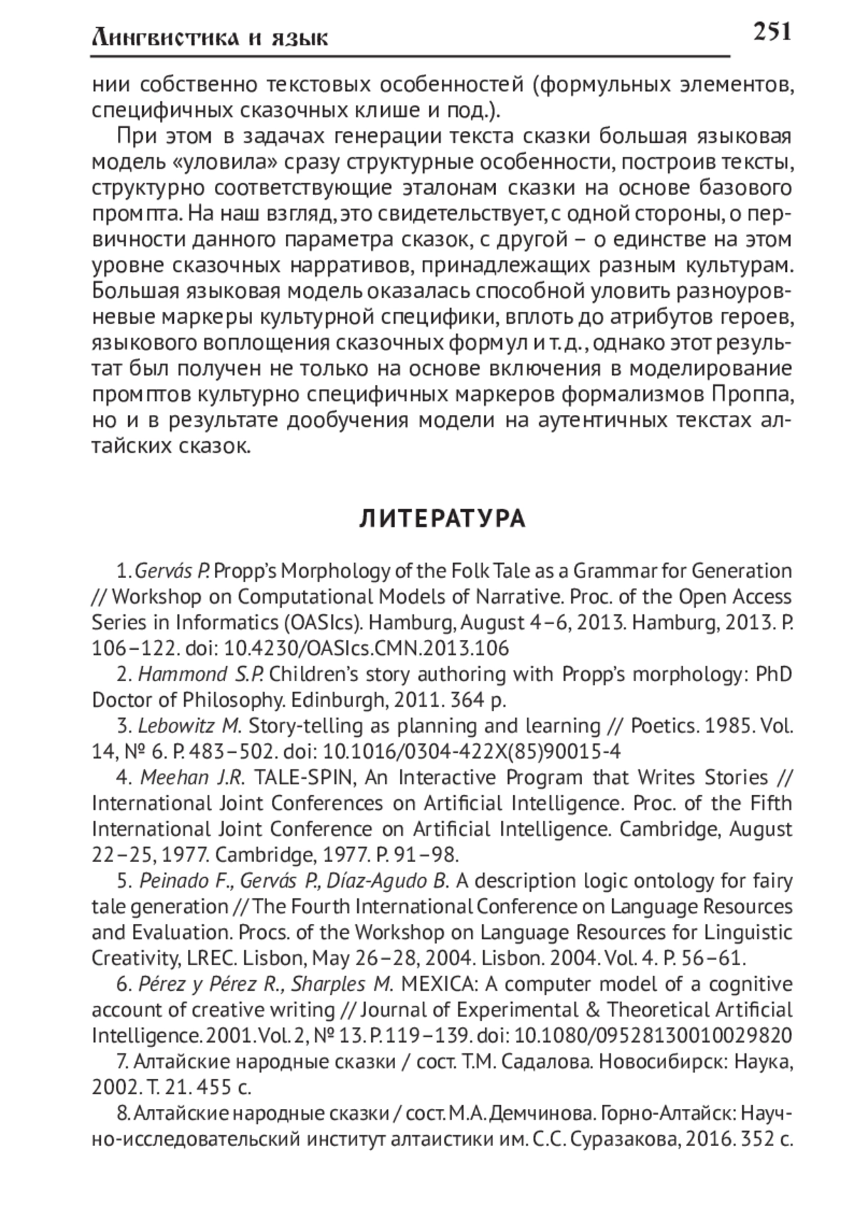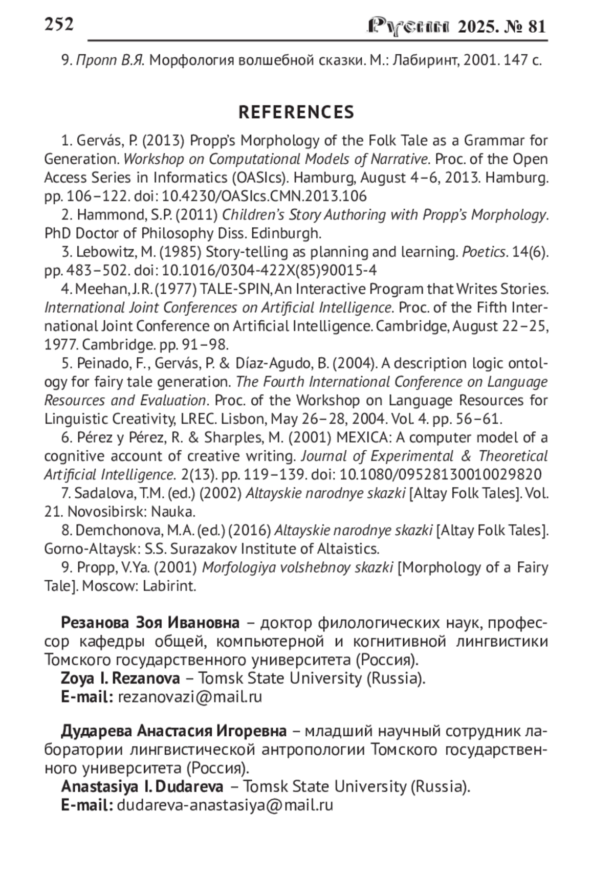 1. Gervás P. Propp’s Morphology of the Folk Tale as a Grammar for Generation // Workshop on Computational Models of Narrative. Proc. of the Open Access Series in Informatics (OASIcs). Hamburg, August 4-6, 2013. Hamburg, 2013. P. 106-122. DOI: 10.4230/OASIcs.CMN.2013.106