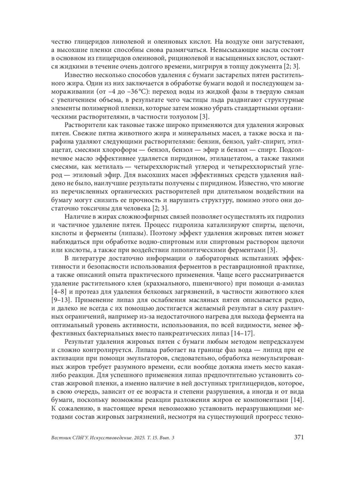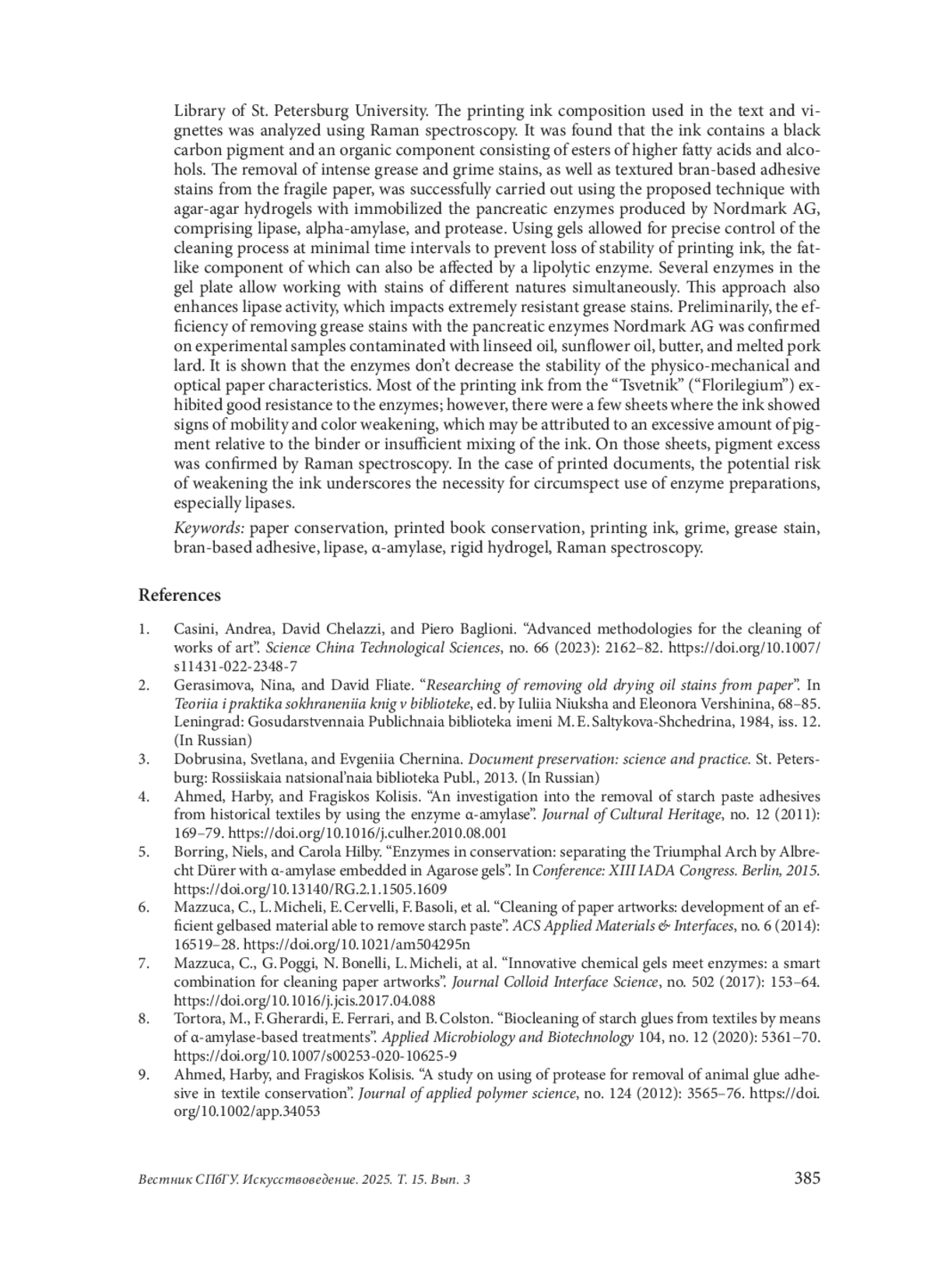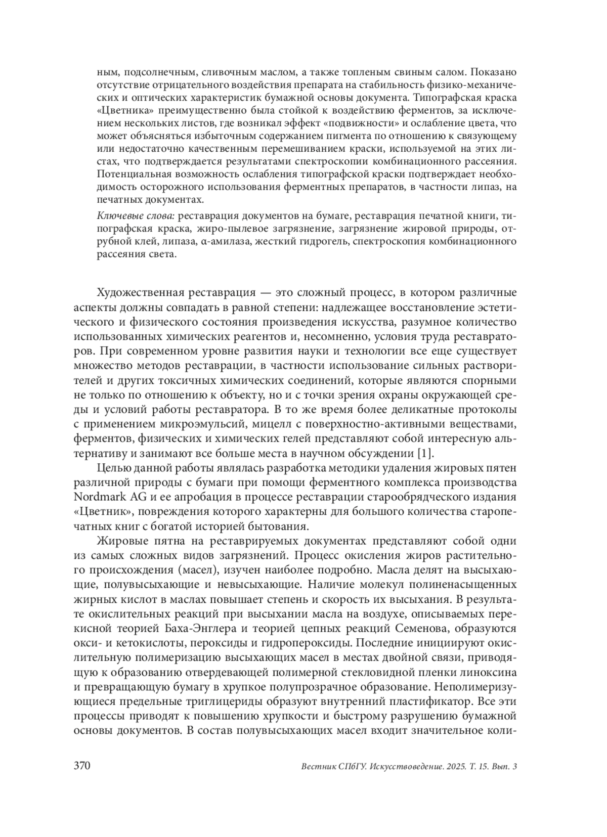 Описан процесс реставрации листов книжного блока старообрядческого издания XVIII в. «Цветник» из отдела редких книг и рукописей библиотеки СанктПетербургского государственного университета. Методом спектроскопии комбинационного рассеяния света в геометрии обратного рассеяния установлено, что в состав типографской краски текста и заставок входит черный углеродный пигмент и органическая составляющая из сложных эфиров высших жирных кислот и спиртов. Удаление интенсивных жировых и жиро-пылевых загрязнений, а также большого количества фактурных пятен отрубного клея с ослабленной материальной основы листов успешно проведено при помощи предлагаемой методики с использованием гидрогелевых аппликаций из агар-агара с иммобилизованным в них панкреатическим ферментным препаратом производства Nordmark AG, содержащим липазу, α-амилазу и протеазу. Использование гелей дало возможность контролировать процесс через минимальные временные промежутки для предотвращения потери стабильности типографской краски, поскольку на ее жироподобную составляющую также может воздействовать липолитический фермент. Присутствие в гелевой пластине нескольких ферментов позволяет одновременно работать с пятнами разной природы и способствует интенсифицированию активности липазы, воздействующей на чрезвычайно стойкие жировые пятна. Предварительно работоспособность методики удаления жировых пятен препаратом Nordmark AG была подтверждена на опытных образцах, загрязненных льняным, подсолнечным, сливочным маслом, а также топленым свиным салом. Показано отсутствие отрицательного воздействия препарата на стабильность физико-механических и оптических характеристик бумажной основы документа. Типографская краска «Цветника» преимущественно была стойкой к воздействию ферментов, за исключением нескольких листов, где возникал эффект «подвижности» и ослабление цвета, что может объясняться избыточным содержанием пигмента по отношению к связующему или недостаточно качественным перемешиванием краски, используемой на этих листах, что подтверждается результатами спектроскопии комбинационного рассеяния. Потенциальная возможность ослабления типографской краски подтверждает необходимость осторожного использования ферментных препаратов, в частности липаз, на печатных документах