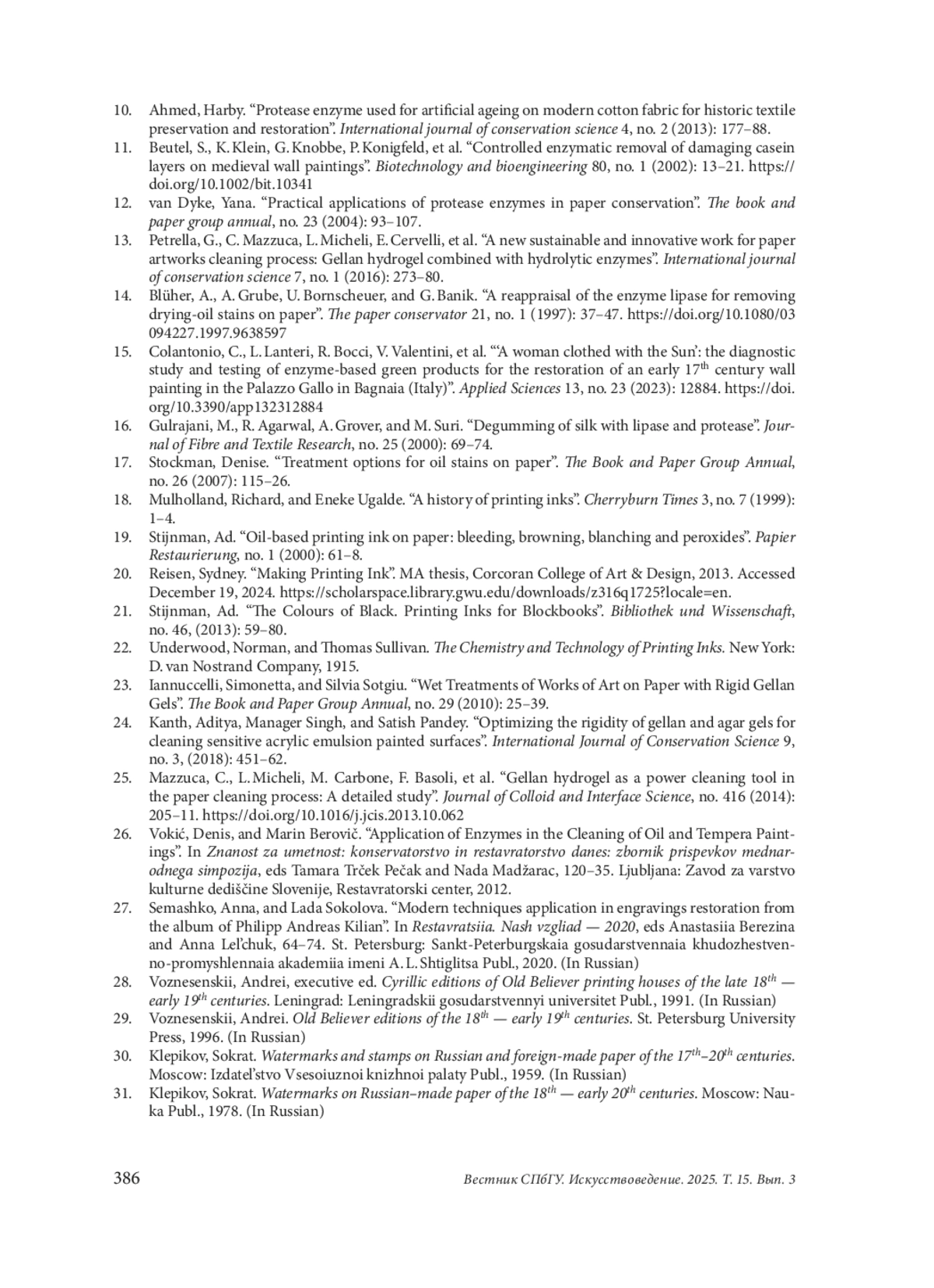 27. Семашко, Анна, и Лада Соколова. “Применение современных методик в реставрации гравюр из альбома Филиппа Андреаса Килиана”. В сб. Реставрация. Наш взгляд - 2020, под ред. Анастасии Березиной и Анны Лельчук, 64-74. СПб.: СПГХПА им. А. Л. Штиглица, 2020.
