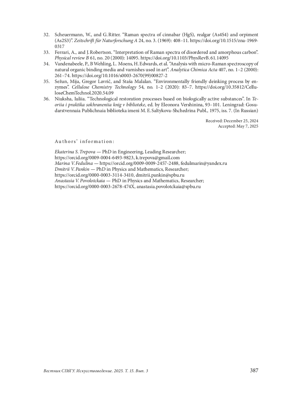 36. Нюкша, Юлия. “Технологические процессы реставрации на основе биологически активных веществ”. В сб. Теория и практика сохранения книг в библиотеке, под ред. Элеоноры Вершининой, 93-101. Л.: Гос. Публ. б-ка им. М. Е. Салтыкова-Щедрина, 1975, вып. 7. DOI: 10.35812/CelluloseChemTechnol.2020.54.09