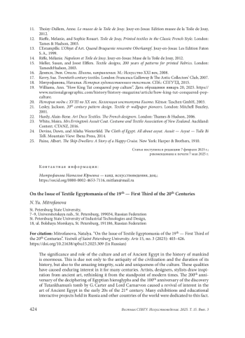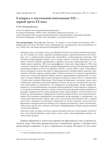 Значение и роль культуры и искусства Древнего Египта в истории человечества огромны. Это связано не только с древностью цивилизации и продолжительностью ее истории, но и с удивительной цельностью, масштабом и уникальностью культуры. Она вызывает непреходящий интерес уже в течение многих столетий. Художники, дизайнеры, стилисты черпают вдохновение в древнем искусстве, переосмысляют его с позиций нового времени. 200-летие расшифровки египетских иероглифов и 100-летие с момента открытия Г. Картером и лордом Карнарвоном могилы Тутанхамона вызвали оживление интереса к искусству Древнего Египта в начале 2020-х годов. Этому факту были посвящены многие выставки и образовательные интерактивные проекты, прошедшие в России и других странах мира. События показали, что диалог современного искусства и искусства Древнего Мира, начатый предыдущими поколениями, не затихает и сегодня. Первая волна такого интереса возникла в начале XIX в. и связана была с Египетским походом Наполеона. Текстильная египтомания составляет лишь часть глобального увлечения культурой Древнего Египта. Но до сих пор масштаб текстильной египтомании не оценивался и не подвергался исследованию. Автор впервые обращается к этой проблематике, на основе анализа выявляет этапы процесса, определяет их хронологические рамки и степень стилистической эволюции заимствований, на примере содержательного иллюстративного ряда демонстрирует отличительные особенности, проявившиеся в оформлении текстиля каждой из волн текстильной египтомании. На основании проведенного исследования автор приходит к заключению, что египетский ориентализм первых двух волн текстильной египтомании XIX и первой трети XX в. сказывался по-разному и затрагивал не только тематику, стилистику изображений и колористическую палитру, но и приемы исполнения, а также технологический аспект, кроме того, активно участвовал в формировании общей художественной стилистики времени