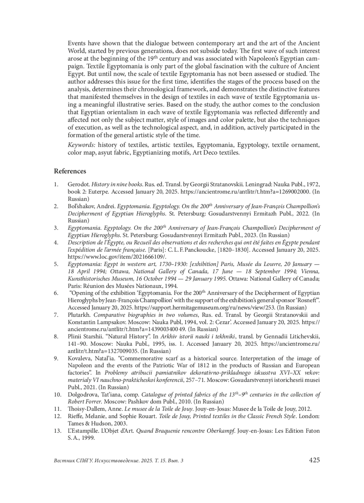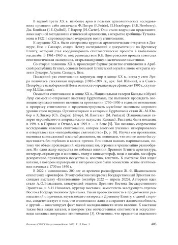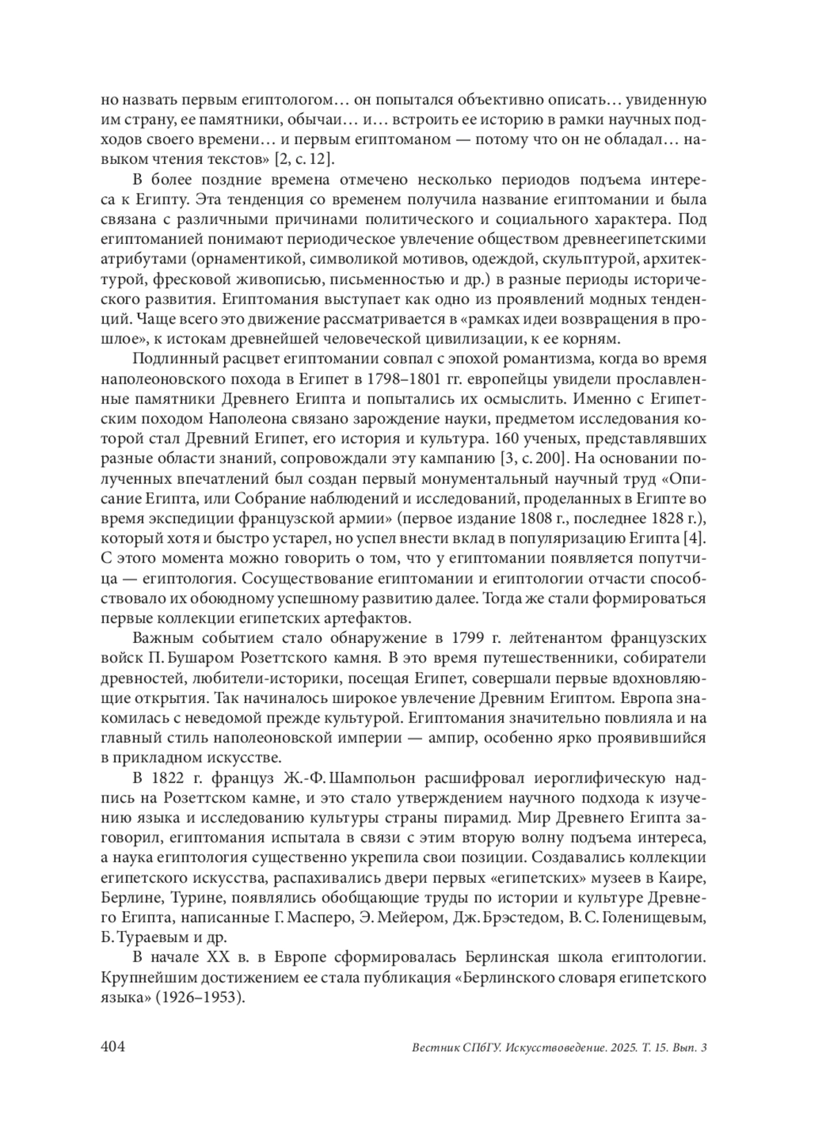 Первые обращения к египетским древностям фиксируются еще со времен античного мира. Описание древнеегипетских памятников, нравов и обычаев было представлено в середине V в. до н. э. Геродотом в его труде «История» [1]. Его «мож- 404 Вестник СПбГУ. Искусствоведение. 2025. Т. 15. Вып. 3 но назвать первым египтологом… он попытался объективно описать… увиденную им страну, ее памятники, обычаи… и… встроить ее историю в рамки научных подходов своего времени… и первым египтоманом — потому что он не обладал… навыком чтения текстов» [2, с. 12].