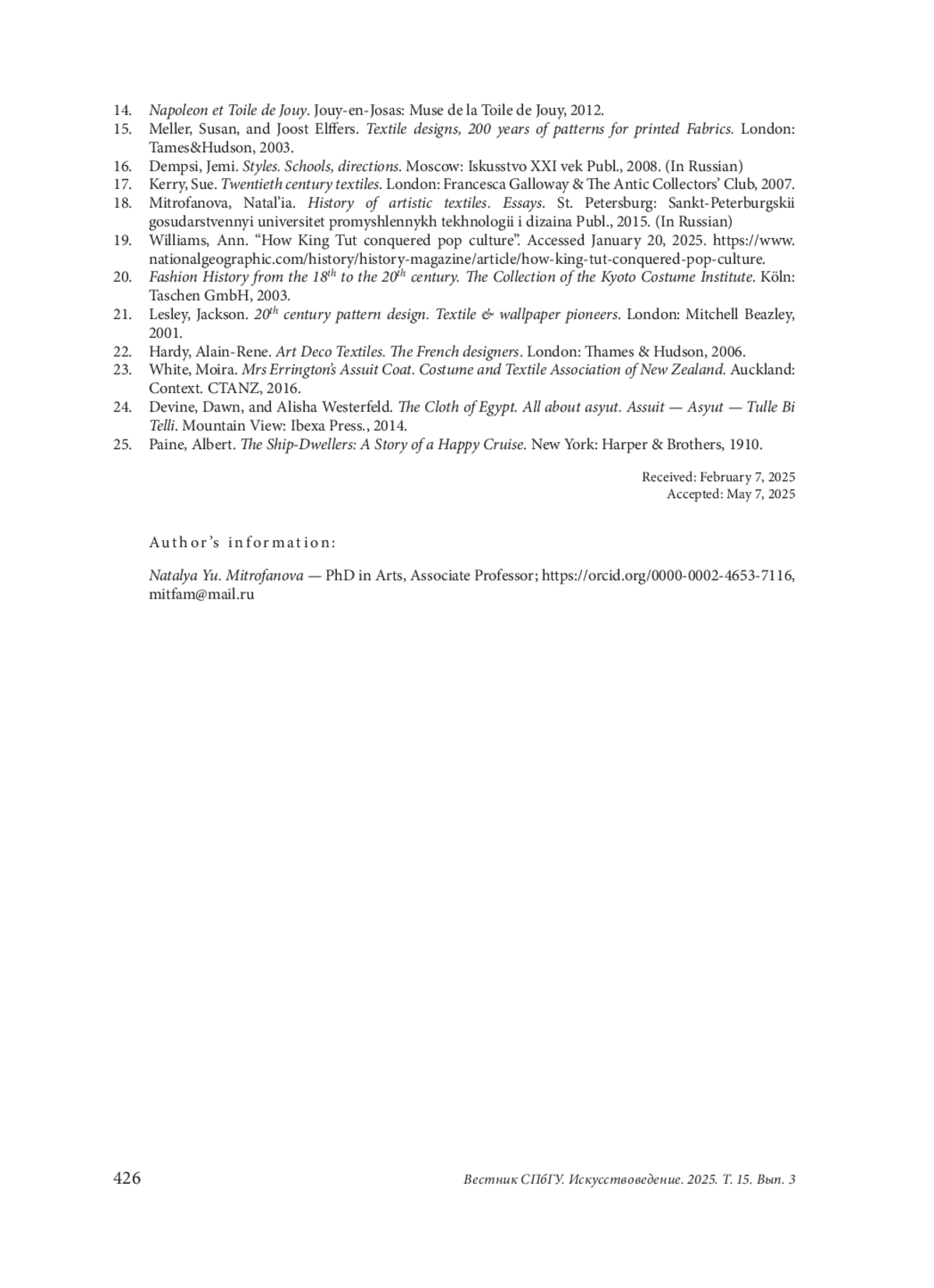 18. Митрофанова, Наталья. История художественного текстиля. СПб.: СПГУТД, 2015.