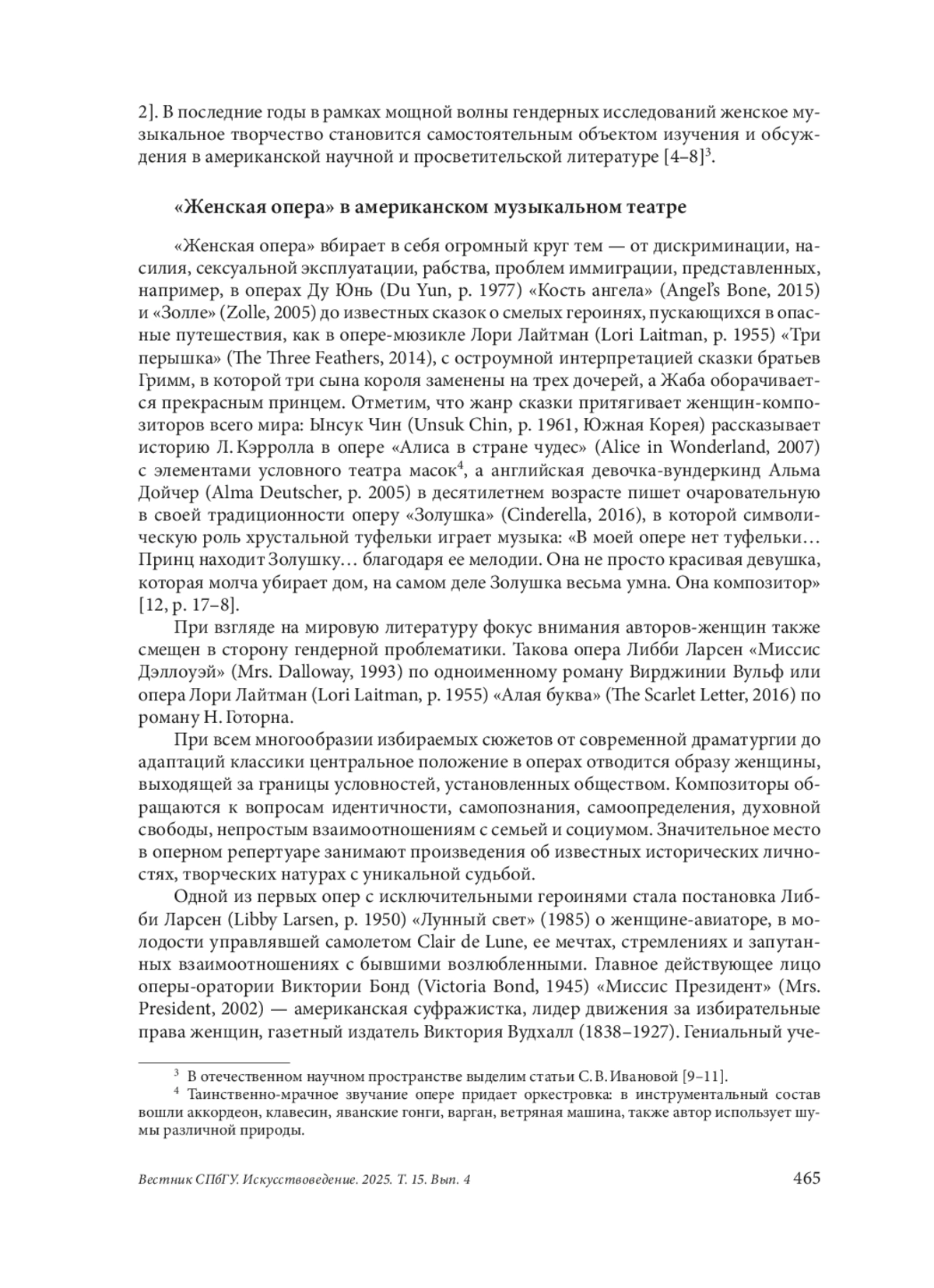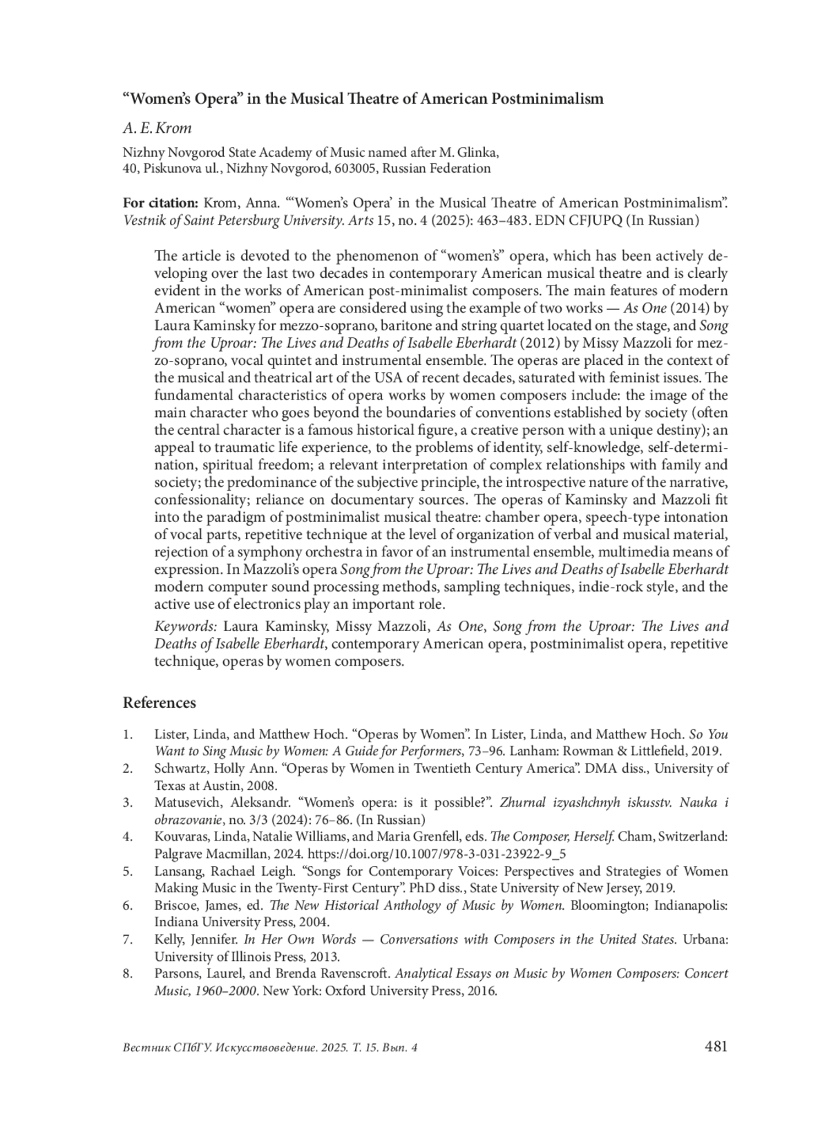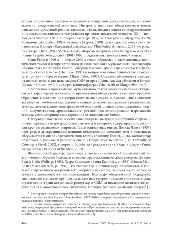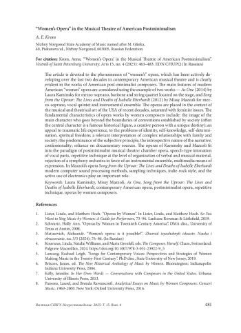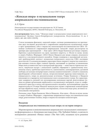 Статья посвящена феномену «женской оперы», активно развивавшемуся на протяжении двух последних десятилетий в современном американском музыкальном театре и ярко проявившему себя в творчестве композиторов-постминималистов США. Основные особенности современной американской «женской» оперы рассмотрены на примере двух произведений — «Как один» (2014) Лауры Камински для меццо-сопрано, баритона и расположенного на сцене струнного квартета, и «Песня из шума: жизнь и смерть Изабель Эберхардт» (2012) Мисси Маццоли для меццо-сопрано, вокального квинтета и инструментального ансамбля. Оперы помещены в насыщенный актуальной проблематикой контекст музыкально-театрального искусства США последних десятилетий. К основополагающим характеристикам оперного творчества композиторов-женщин отнесем образ главной героини, выходящей за границы установленных обществом условностей (часто центральный персонаж — известная историческая личность, творческая натура с уникальной судьбой); обращение к травматичному жизненному опыту, проблемам идентичности, самопознания, самоопределения, духовной свободы; актуальная интерпретация сложных взаимоотношений с семьей и социумом; преобладание субъективного начала, интроспективный характер повествования, исповедальность; опора на документальные источники. Оперы Камински и Маццоли вписываются в парадигму постминималистского музыкального театра. Его характеризуют камерность, речевой тип интонирования вокальных партий, репетитивная техника на уровне организации вербального и музыкального материала, отказ от симфонического оркестра в пользу инструментального ансамбля, мультимедийные средства выразительности. В опере Маццоли важную роль играют современные компьютерные методы обработки звука, техника сэмплирования, стилистика инди-рока, активное использование электроники