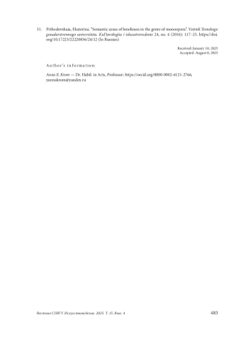 31. Приходовская, Екатерина. “Смысловые ареалы одиночества в жанре монооперы”. Вестник Томского государственного университета. Культурология и искусствоведение 24, no. 4 (2016): 117-25. DOI: 10.17223/22220836/24/12