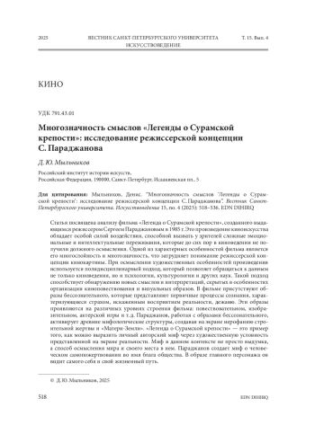Статья посвящена анализу фильма «Легенда о Сурамской крепости», созданного выдающимся режиссером Сергеем Параджановым в 1985 г. Это произведение киноискусства обладает особой силой воздействия, способной вызвать у зрителей сложные эмоциональные и интеллектуальные переживания, которые до сих пор в киноведении не получили должного осмысления. Одной из характерных особенностей фильма является его многослойность и многозначность, что затрудняет понимание режиссерской концепции кинокартины. При осмыслении художественных особенностей произведения используется полидисциплинарный подход, который позволяет обращаться к данным не только киноведения, но и психологии, культурологии и других наук. Такой подход способствует обнаружению новых смыслов и интерпретаций, скрытых в особенностях организации киноповествования и визуальных образов. В фильме присутствуют образы бессознательного, которые представляют первичные процессы сознания, характеризующиеся страхом, искаженным восприятием реальности, дежавю. Эти образы проявляются на различных уровнях строения фильма: повествовательном, изобразительном, актерской игры и т. д. Параджанов, работая с образами бессознательного, активирует древние мифологические структуры, создавая на экране иерофанию строительной жертвы и «Матери-Земли». «Легенда о Сурамской крепости» — это пример того, как можно выразить личный авторский миф через художественную условность представленной на экране реальности. Миф в данном контексте не просто выдумка, а способ осмысления мира и своего места в нем. Параджанов создает миф о человеческом самопожертвовании во имя блага общества. В образе главного персонажа он видит самого себя и свой жизненный путь