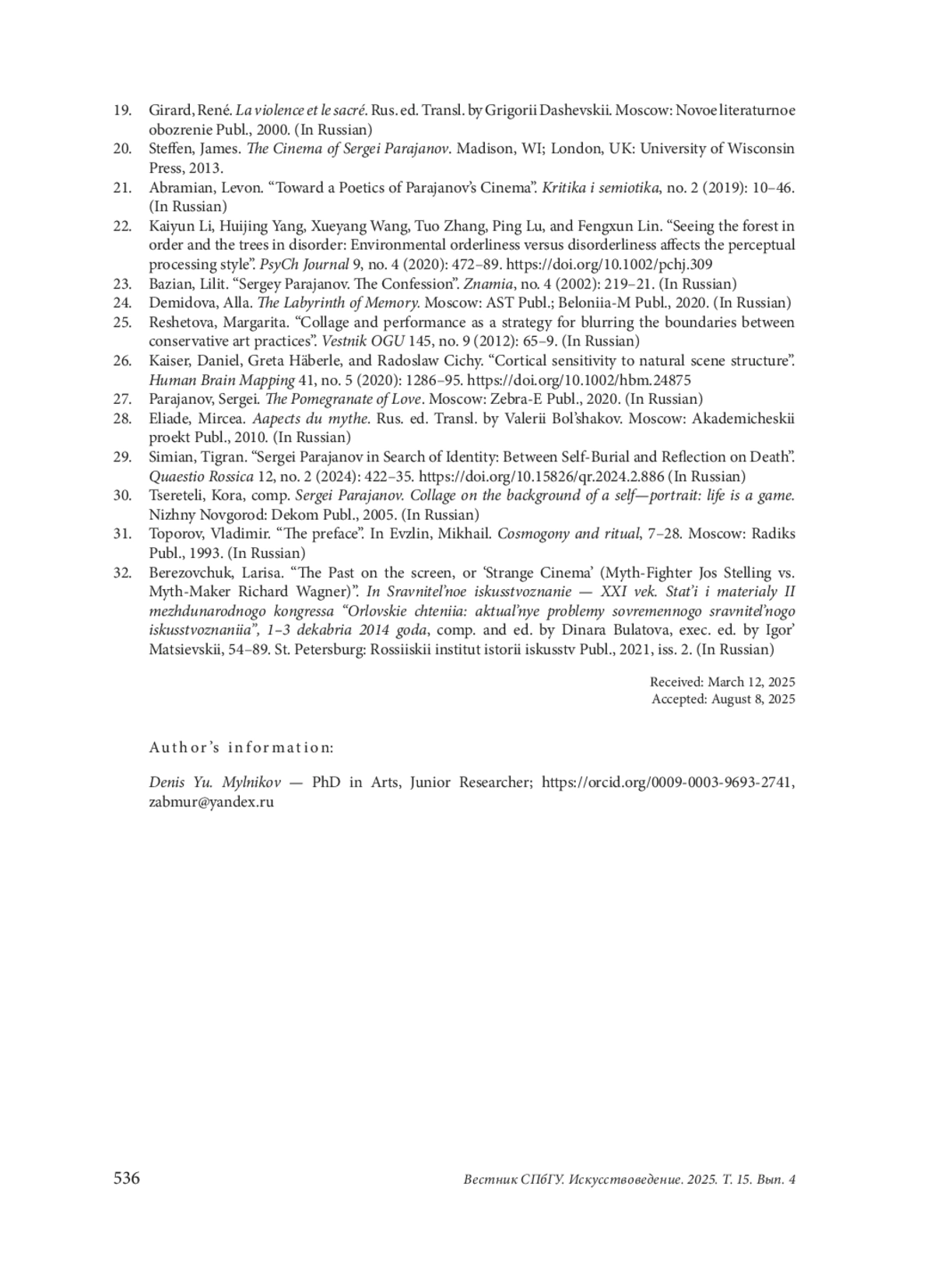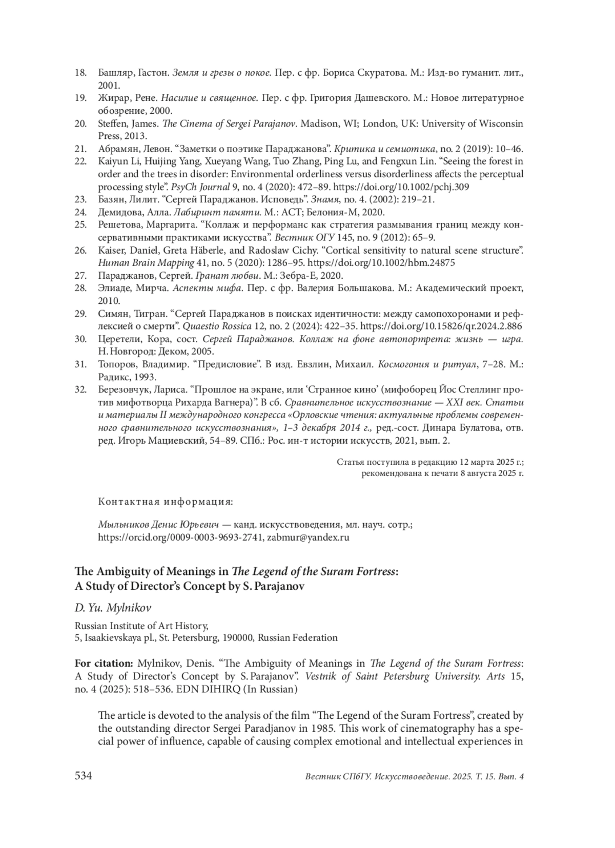 29. Симян, Тигран. “Сергей Параджанов в поисках идентичности: между самопохоронами и рефлексией о смерти”. Quaestio Rossica 12, no. 2 (2024): 422-35. DOI: 10.15826/qr.2024.2.886 EDN: VVPVSF