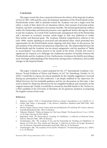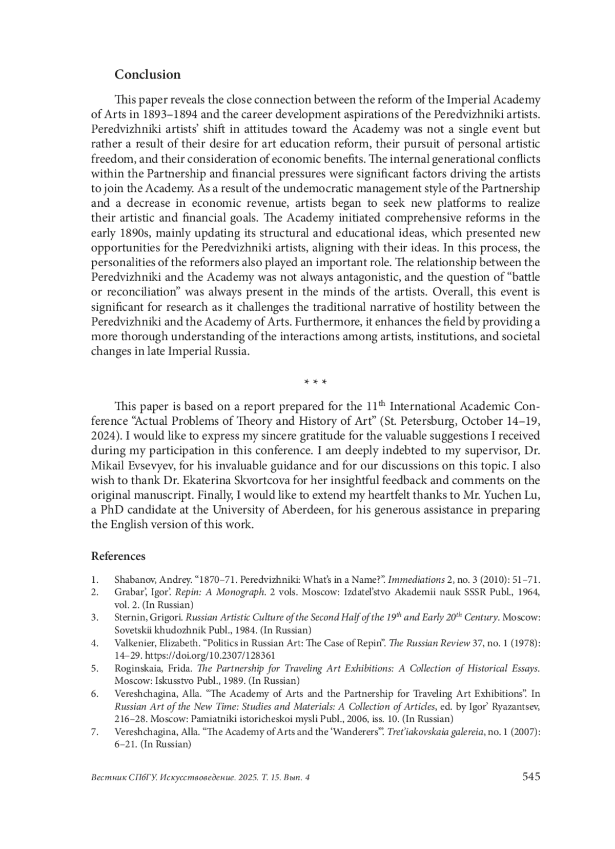 This paper analyzes the complex historical context surrounding the incorporation of the Peredvizhniki artists into the Imperial Academy of Arts in the 1890s. Unlike previous research, this study examines the external factors that influence the artists’ relationship with the Academy and analyzes their personal motivations and internal experiences from both sociological and psychological perspectives. Particular emphasis is placed on the role of commercial influences in their decision-making processes. The study argues that the shift in the Peredvizhniki artists’ attitudes toward the Academy was not a single event but rather the result of multiple interrelated factors, including their desire for art education reform, pursuit of personal artistic freedom, and consideration of economic benefits. Internal generational conflicts within the Partnership for Traveling Art Exhibitions, combined with financial pressures, prompted the artists to seek alternative institutional affiliations. The Academy underwent comprehensive reforms in the early 1890s, particularly regarding its organizational structure and educational ideas. These changes created new opportunities that increasingly resonated with the evolving values of the Peredvizhniki. Furthermore, the personalities of the reformers significantly influenced the development of this event. Ultimately, the relationship between the Peredvizhniki and the Academy was not always antagonistic. The question of battle or reconciliation lingered in the artists’ minds throughout their evolving relationship with the Academy.