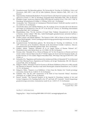 44. Balagurov, Nikita. “Alexander III and Art Section at All-Russia Exhibition in Moscow in 1882: towards the National Art Museum”. Nauchnye trudy Sankt-Peterburgskoi Akademii khudozhestv, no. 35 (2015): 175-91. (In Russian).