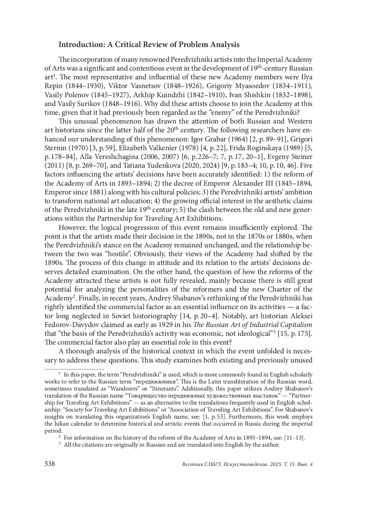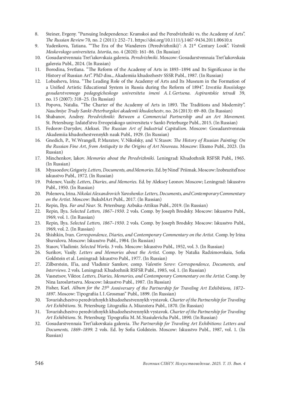 7. Vereshсhagina, Alla. “The Academy of Arts and the ‘Wanderers’”. Tret’iakovskaia galereia, no. 1 (2007): 6-21. (In Russian).